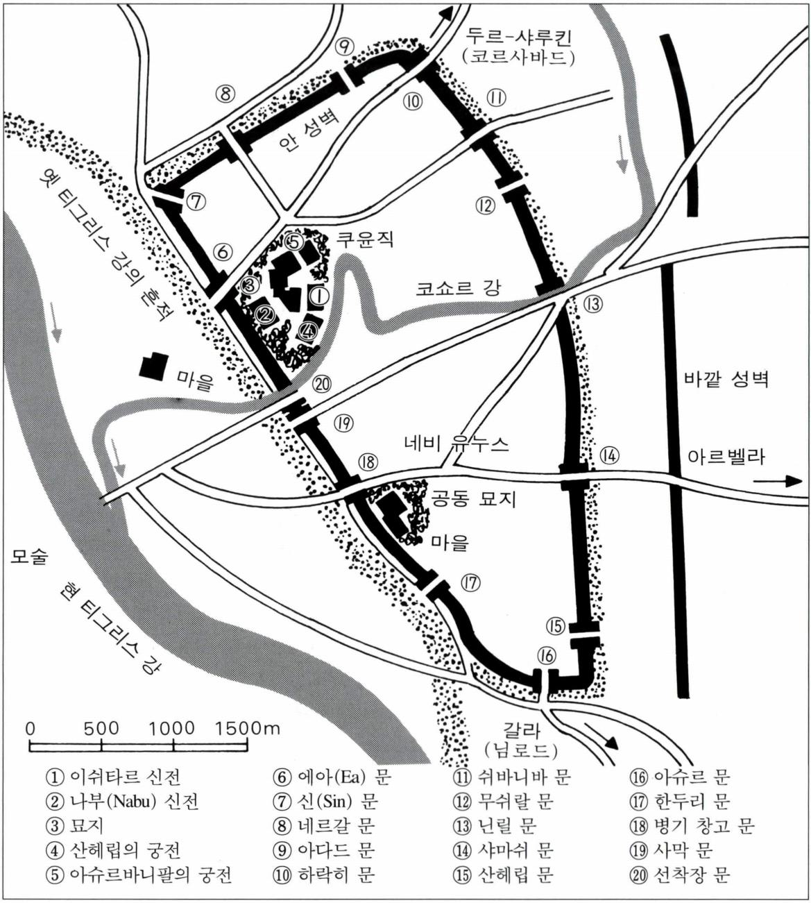 아시리아 제국 말기의 수도(首都). 성서의 이 도시에 대한 언급은 제국 패망 전 몇 십 년 동안에 해당된다. 니 느웨의 폐허는 현재 이라크에서 두 번째로 큰 도시인 모 술(Mosul)에 속해 있다. 이 유적은 티그리스 강의 동쪽에 자리잡고 있고, 신도시 모술은 티그리스 강 건너편, 즉 서쪽에 있다. 이 지역은 분명히 중요한 거주지였고, 그 주위는 예나 지금이나 여전히 비옥한 농경지이다. 교역 면에서 볼 때 니느웨는 티그리스 강을 오르내리는 남북 교역로와 쿠르드(Kurd) 산맥의 남쪽 산기슭을 따라가는 중요한 동서 교역로가 교차되는 곳이다. 이 도시의 전성기 때에는 둘레가 대략 13km 되는 지 역이 성벽으로 둘러싸여 있었다. 이 반경 안에는 코쇼르 (Khoshor) 강을 사이에 두고 텔(tell) 쿠윤직(Kuyunjik)과 텔 네비 유누스(Nebi Yunus)가 있는데, 쿠윤직이 네비 유 누스보다 두 배 정도 크다. 니느웨의 유적에는 옛 전승이 현재까지 계속되고 있다. 네비 유누스에는 예언자 요나 의 무덤과 그를 모시는 사당이 회교 사원에 있고, 또한 이 사원에는 요나의 이야기를 상기시키는 고래의 뼈가 걸려 있다. 네비 유누스는 새 마을과 공동 묘지뿐만 아니 라, 이러한 종교적 성격으로 인해 현대 고고학자의 손이 전혀 미치지 않았고, 쿠윤직만이 광범위하게 발굴되었 다. 1842년 프랑스 학자 보타(P.E. Botta)가 텔 쿠윤직을 발굴하기 시작하였고, 1850년 봄에 영국인 레이야드 경 (Sir A.H. Layard)과 갈대아 출신인 라쌈(H. Rassam)이 아 슈르바니팔 궁전과 토판(土版, clay tablet)이 가득한 도서 관을 찾아냈다. 아슈르바니팔의 도서관이야말로 바빌로 니아와 아시리아의 역사와 문화를 알려 주는 가장 중요 한 출처이다. 찾아낸 토판은 25,000개 이상이나 된다. 또 전쟁이나 사냥 장면을 묘사한 장려한 부조(浮彫)들이 궁전에서 발견되었고, 이 중 상당수의 유물들이 대영 박 물관에 소장되었다. 영국 탐사단의 니느웨 발굴 이래 대 영 박물관으로 옮긴 부조들을 주제별로 분류해도 50점 이 넘는다. 〔역 사〕 아시리아에는 네 개의 큰 도시로 아슈르, 갈 라, 아르벨라, 그리고 니느웨가 있었다. 니느웨의 수호신 은 사랑과 전쟁의 여신 이쉬타르(Ishtar)였는데, 이 여신 은 또한 아르벨라의 수호신이었다. 니느웨에는 선사 시 대(기원전 5000경)에 거주한 흔적이 있고, 기원전 2500 년경에는 도시로 성장하였다. 이 당시에 니느웨는 남쪽 의 아카드(Akkad) 왕국의 정치적 지배 아래 있었는데 이 때의 왕 만이쉬투슈(Manishtushu, 기원전 2269~2255)가 이 쉬타르 성전을 재건했고, 나람신(Naramsin, 기원전 2254 ~2218)은 이 도시에 기념비를 남겼다. 만이쉬투슈의 업 적을 언급한 옛 아시리아의 샴쉬아다드 1세(Shamshiadad 1, 기원전 1813~1781)도 이쉬타르 성전을 복구하였다. 옛 바빌로니아의 함무라비(Hammurabi, 기원전 1792~ 1750) 법전의 서문(iv60)도 유명한 이쉬타르 성전이 니느 웨에 있다는 것을 알려 주는 중요한 단서이다. 기원전 15세기에서 14세기 중반까지 니느웨가 미타 니(Mitanni) 왕국 치하에 있었을 때, 미타니 왕 투쉬라타 (Tushratta)는 이집트 파라오 아멘오피스 3세(Amenophis Ⅲ, 기원전 1402~1363)의 치통(齒痛)을 낫게 하려고 이 쉬타르 신상을 특별한 선물로 보냈었다. 그러나 니느웨 는 아슈르의 도시 국가 통치자들 덕분에 미타니의 지배 로부터 벗어났다. 이것이 아시리아 국가 성립의 시작이 었고 아슈르우발리트 1세(Ashuruballint I , 기원전 1362~ 1327)가 최초의 '아시리아 땅의 왕' 으로 등장하였다. 이 때부터 니느웨는 아시리아의 다른 핵심 도시들과 함께 중요한 곳으로 인식되었다. 중기 아시리아 제국 시대 즉 살마네셀 1세(Shalmaneser I , 기원전 1273~1244)로부터 아슈르바니팔(Ashutbanipal, 기원전 668~627) 때까지 최소 한 13명의 왕들이 니느웨에 궁전을 지었고, 또 이쉬타르 성전을 개축하였다. 산헤립(Sennacherib, 기원전 704~681)은 점점 커가는 아 시리아 제국의 수도로 니느웨를 선택한 다음 그곳에 대 규모의 건축 사업을 벌였다. 도시의 남서쪽에 기반을 12~15m 정도 높인 다음, 집회실만 해도 70개가 넘는 웅장한 궁전을 지었다. 왕궁의 성문에는 인간 모습을 한 날개 달린 황소상을 세웠고, 여러 가지 아름다운 돌과 하 얀 석고로 줄무늬를 쳐서 성벽을 꾸몄다. 왕궁의 벽에는 전쟁을 승리로 이끄는 장면이나 사냥하는 장면, 또는 수 호신들을 부조로 묘사하였다. 기원전 700년 이집트, 에 티오피아와 합세하여 아시리아 제국의 통치에 반란을 일 으킨 유대 왕 히즈키야(기원전 727~698)를 진압하기 위 하여 예루살렘을 공격하기에 앞서 팔레스티나 남부에 위 치한 이집트 변경의 주요 요새인 라키쉬를 포위하고 점 령하는 장면과, 높은 왕좌에 앉은 산헤립에게 항복하며 전리품을 바치는 장면도 바로 이곳에 있다(2역대 32장 ; 이사 36장). 산헤립은 또한 도시를 확장하고 두께 12~ 15m, 높이 30m 되는 "산처럼 높은" 성벽을 흙 벽돌로 쌓았다. 15개의 성문을 만들고, 왕궁으로부터 도시 중심 가를 통해 티그리스 강을 건너는 다리까지 행렬로(行列 路)를 만들었다. 산헤립의 기술자들은 그가 만든 큰 정 원에 물을 대기 위해 도시로 물을 끌어올리는 복잡한 구 조의 운하와 수로를 만들었다. 그리하여 도시 전체가 온 갖 식