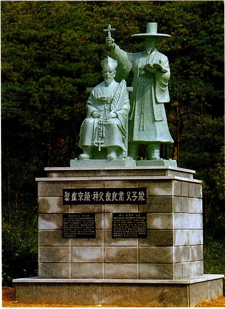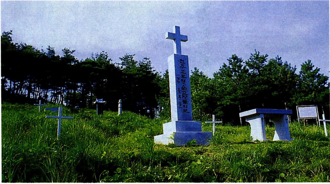 성 최경환· 신부 최양업 부자상(왼쪽)과 다락골 무명 순교자들의 묘.