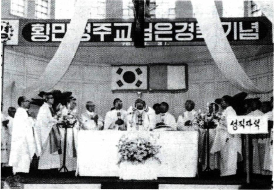 황민성 주교는 1973년에 '화해의 성년' 을 맞이하여 대흥동 성당과 신합덕 성당을 전대사 순례 성당으로 지정하였고, 1974년에는 시국 사건과 관련하여 인권 회복기도회를 전 교구적으로 개최하였는데, 이것은 대전교구의 전 신자들이 사회의 아픔에 동참하는 계기가 되었다. 뿐만 아니라 교구 단위 및 전국 행사로 1978년에 교구 성체 대회가 성모여고에서 열려 교구 신자 1만 5천여 명이 참가하였고, 1979년에 전국 울뜨레아가 충무 체육관에서 개최되었다. 1975년 9월 갈매못 순교 사적지에 순교비가 건립되었고, 1975년 10월 24일에는 해미 순교 사적지에 순교 현양탑이 건립되었으며, 1983년 12월 해미 생매장지가 확보되었다. 1982년에는 청양 본당에서 다락골 줄무덤에 무명 순교자비를 건립한 뒤 사적지로 조성하였다. 이와 함께 교구 신앙 대회가 1981년 10월 1일, 솔뫼에서 열렸는데, 이때 피정의 집 기공식도 있었다. '솔뫼 피정의 집' 은 신자들의 성금과 교구 보조로 1983년에 완공되었다. 또 1983년 5월 5일에는 제4차 전국 민족 복음화 대회가 대전 공설 운동장에서 개최되었고, 9월에는 가톨릭 교육 회관이 증축 개관되었다.