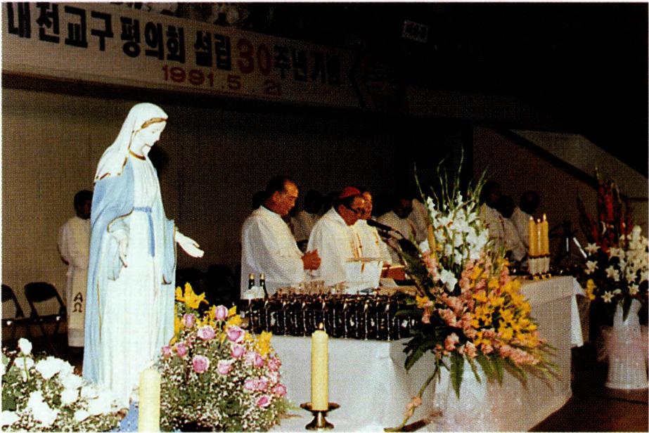 〔교구의 발전과 현재〕 교구 설립 30주년 이듬해인 1989년부터 대전교구에서는 새 교구청사의 마련, 사회와 함께하는 교회상 확립, 가톨릭 대학교 설립 등으로 면모를 일신하게 되었다. 우선 1989년 10월 4일에 개최된 '서울 제44차 세계 성체 대회' 에 전 신자들이 동참하면서 본당별 성체 대회와 한마음 한 몸 운동이 전개되기 시작하였고, 그 해 12월 16일에는 용전동에 마련된 부지에서 새 교구청사 기공식이 거행되었다. 이 중 청사 건립은 순조롭게 진행되어 1991년 7월 8일에는 대흥동 구청사에서 신청사로 이전이 이루어졌고, 8월 5일에는 경 주교 집전으로 축성식이 거행되었다. 1991년 11월 28일에는 농촌 돕기 차원에서 이루어진 '우리 밀 살리기 운동 본부' 가 발족된 것을 계기로 이 운동이 전 교구 차원으로 전개되기 시작하였으며, 이어 1994년 8월 29일에는 대전교구의 '우리 농산물 유통 센터' 가 대덕구 오정동에서 기공식을 갖고 12월 7일에는 그 축성식 및 개장식이 있게 되었다.