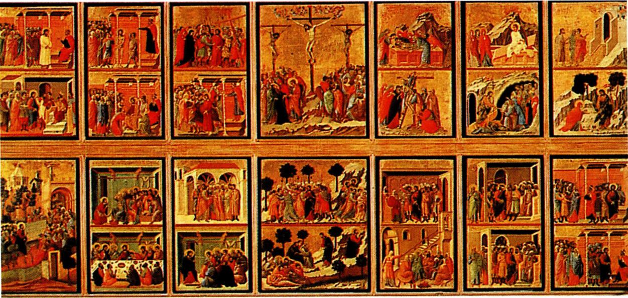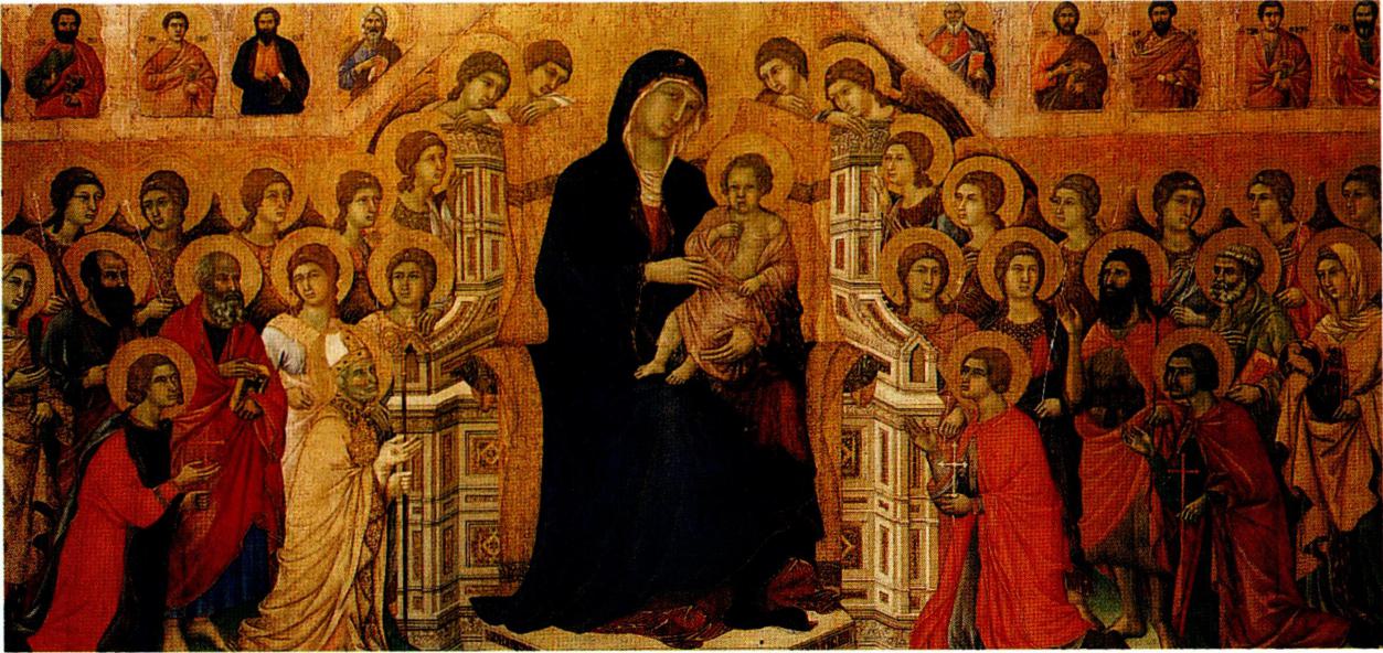 <왕좌의 성모>()와 그 안쪽에 그려진 그리스도의 생애 여러 장면(두초 작) .