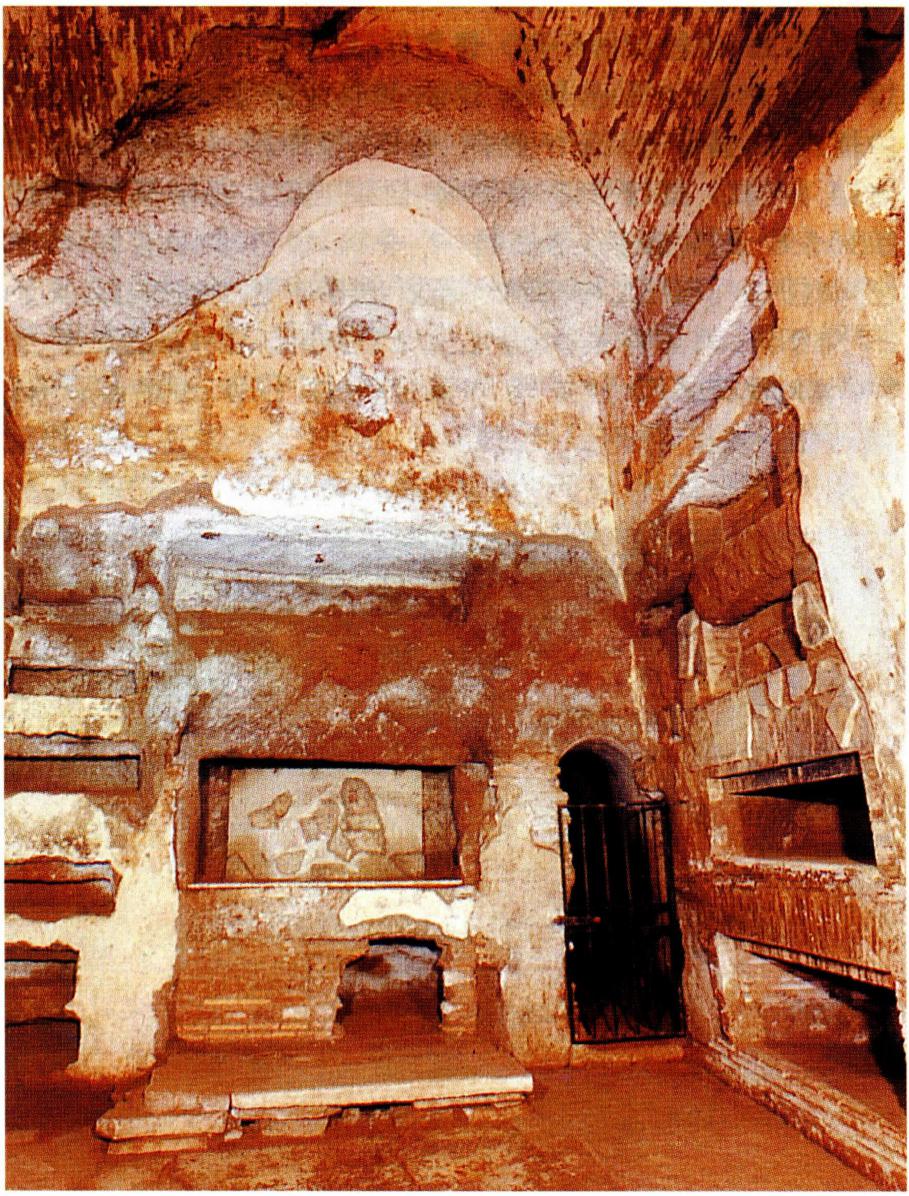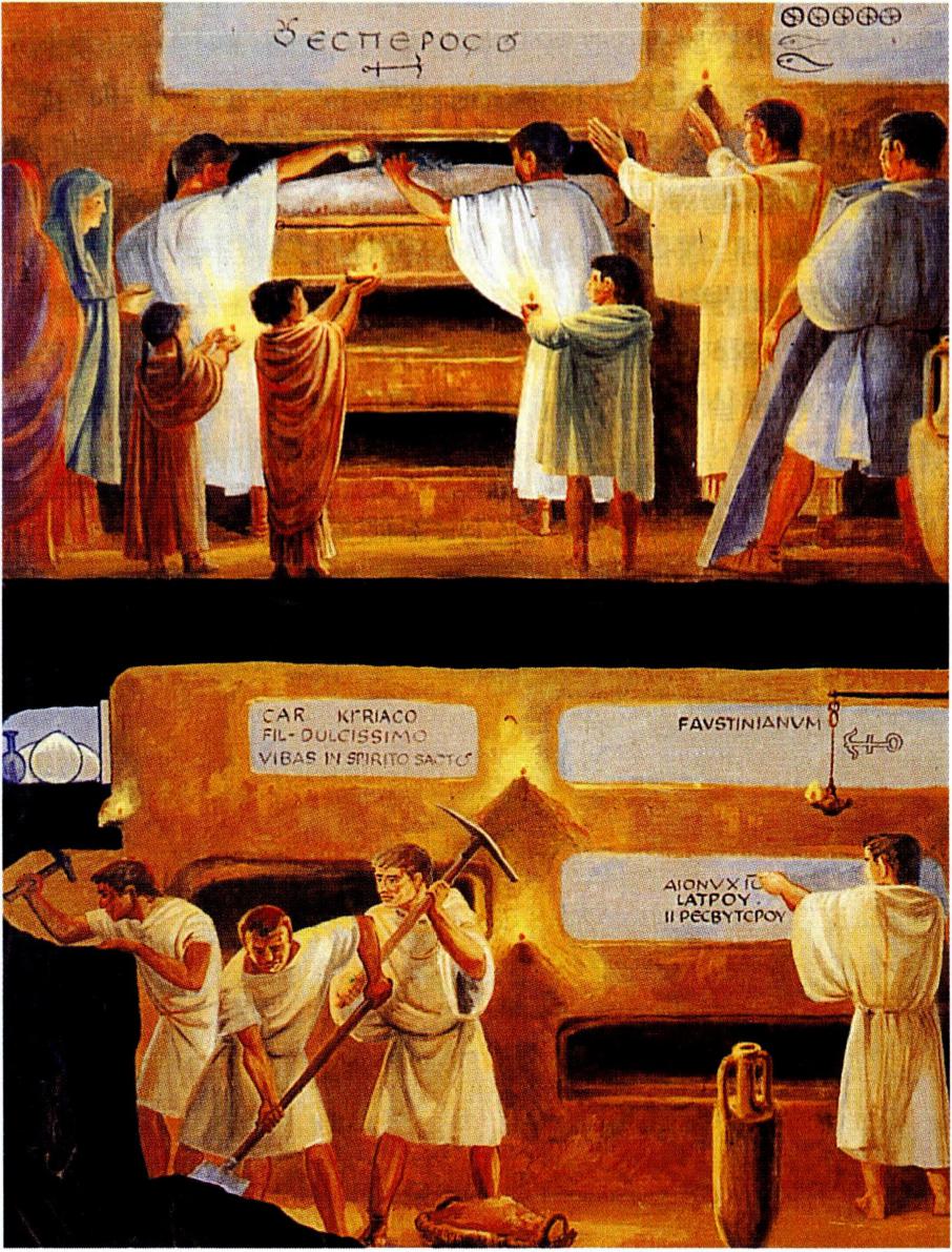 카타콤바에 매장하는 모습을 그린 그림(왼쪽)과 가이오 교황의 지하 묘소 내부.