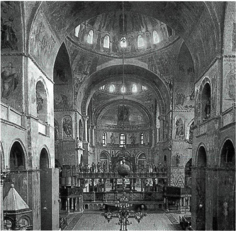 여러 가지 색깔의 작은 조각들을 접착시켜 표현하는 모자이크(왼쪽)와 모자이크로 꾸며진 베네치아의 성 마르코 대성당 내부.