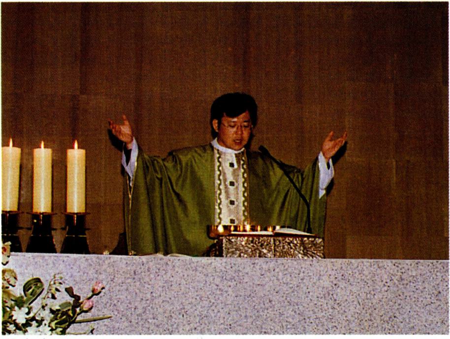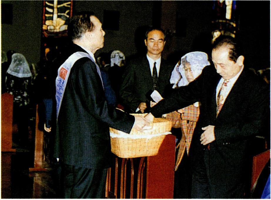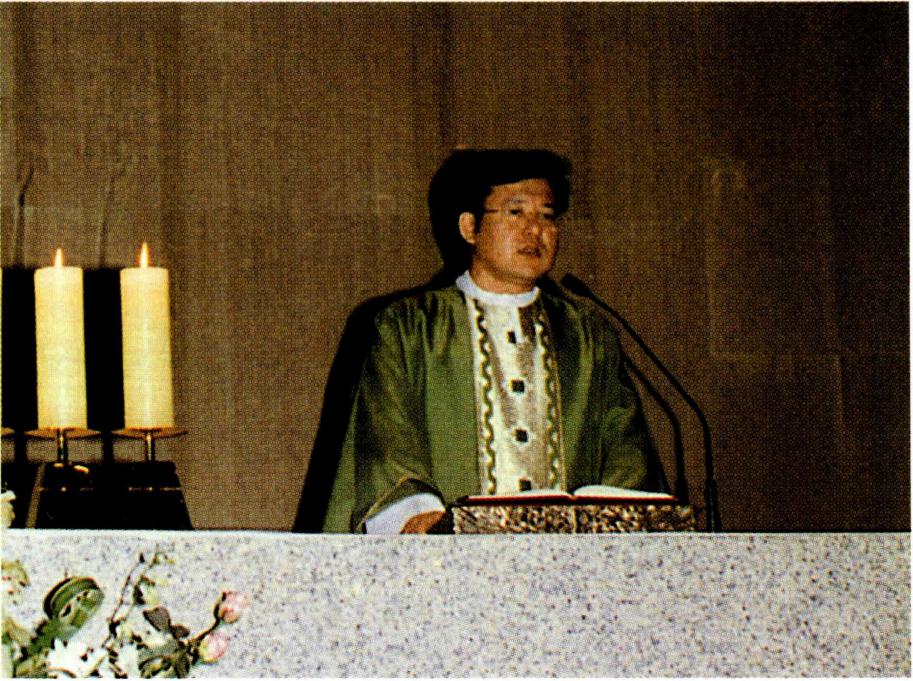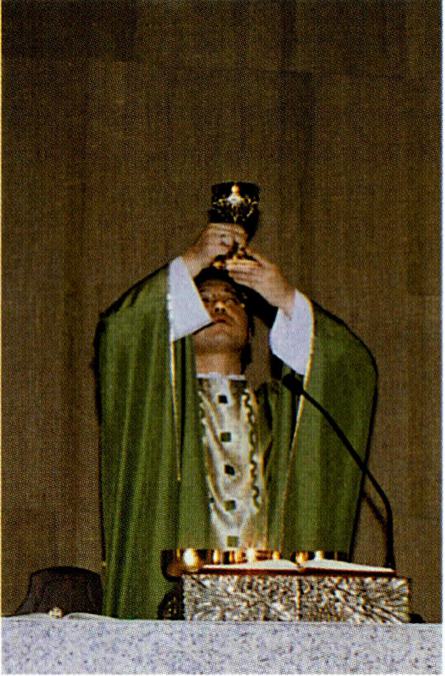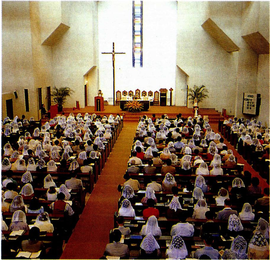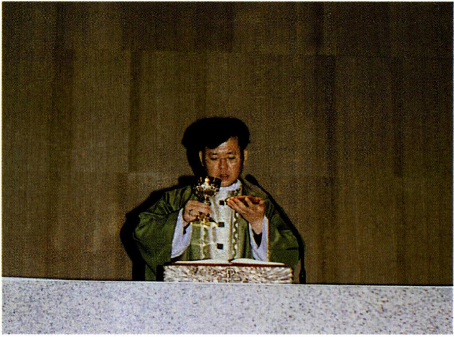 〔생명의 나눔〕 하느님과 인간 간의 수직적 방향선을 잃어 가는 현대인들은 인간 상호간의 수평선도 잃어 가 고 있다. 영원한 생명의 근원인 하느님으로부터 멀어져 가는 현대인은 자연히 현세주의, 물질 만능주의, 감각적 향락주의에 빠질 수밖에 없다. 자연 과학, 우주 공학, 전 자 공학 등 현대의 산업화가 전 우주와 전세계를 한 덩어 리로 만들고 시공의 한계를 넘는 단계에 도달하였지만 그렇다고 인간 상호간의 간격까지 초월시켰다고 볼 수는 없다. 이러한 산업화의 물결 속에서 동서간, 국가간, 민 족간, 사회간, 인간간의 관계가 소월해짐으로써 현대인 은 스스로 소외감을 느끼게 되고 아집과 정신적 이기주 의의 노이로제에 사로잡혀 있다. 이와 같은 상황에 처해 있는 현대인들에게 종교는 그들이 이웃이 되고 더불어 활기 있게 살아갈 수 있는 계기를 마련해 주어야 할 것이 다. 예수 그리스도의 십자가 상 제사는 '모든 이를 위하 여' 자신을 희생한 행위이고 모든 이에게 참되고 영원한 생명을 가져다 준 행위이다. 십자가 위에서 벌린 예수 그 리스도의 두 팔은 모든 인간, 특히 소외당하고 가난하고 병든 사람들을 함께 모으고 참 생명을 주는 행위였다. 모 든 이에게 영원한 생명을 누리게 하는(요한 3, 14-15) 예수의 십자가는 천상과 지상을 이어 주는 수직선과 산 이 와 죽은 모든 이를 연결시켜 주는 수평선의 만남이다. 이 십자가 상 제사를 재현하고 기념하는 미사는 모든 이에 게 생명의 음식을 제공하는 잔칫상이다. "나는 하늘에서 내려온 살아 있는 빵입니다. 내가 줄 빵은 곧 내 살로서 세상의 생명을 위해 주는 것입니다"(요한 6, 51). "너희는 모두 이것을 받아먹어라. 이는 너희를 위하여 내어 줄 내 몸이다. 너희는 모두 이것을 받아 마셔라. 이는 새롭고 영원한 계약을 맺는 내 피의 잔이니 죄를 사하여 주려고 너희와 모든 이를 위하여 흘릴 피이다."