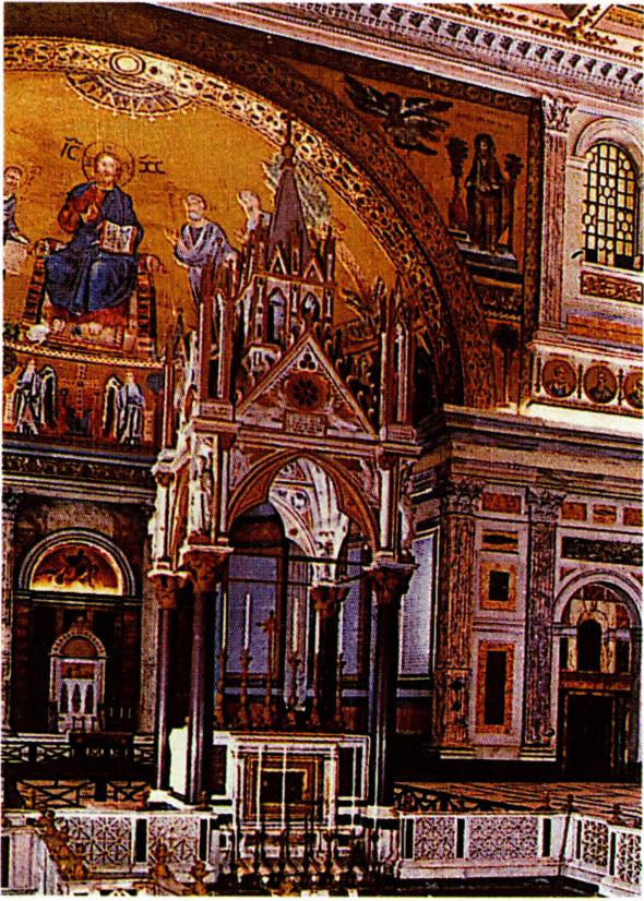 바오로 사도의 무덤 위에 있는 교황 제대 위의 감실은 1285년에 감비오(Armoffoiomimio)가 제작한 최고의 걸작품이다. 그리고 1823년 때 화재 때에도 손상되지 않은 감실 위의 승리의 아치 뒤에 있는 앱스(apse, 後陣)의 모자이크는 그리스도와 베드로, 바오로 및 다른 제자들이 그려진 5세기의 작품이다. 그 바깥에는 구약성서의 내용을 소재로 한 그림들이 부조되어 있다. 석조 기둥이 중앙 제단의 천장을 떠받치고 있으며, 그 아래 원형의 갱도로 연결된 지하에는 화려한 관이 있고 그곳에 성 바오로의 유물이 보관되어 있다. 뒷 벽에도 13세기 때의 모자이크가 그려져 있다. (-> 가톨릭 건축 ; 대성전 ; 바오로)