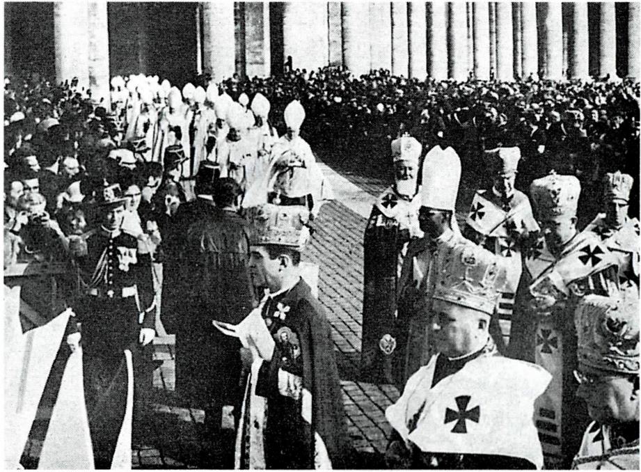 1869년 12월 8일 공의회 참석 자격이 있는 1,050명 의 교부들 중에서 774명이 성 베드로 대성전에 자리를 잡은 가운데 제1차 바티칸 공의회 개회식이 성대히 거행 되었다. 참석 교부들의 3분의 2가 유럽인들이었고, 이들 중 3분의 1이 이탈리아인들이었다. 아시아, 아프리카, 오세아니아와 같은 선교 지방에서 온 주교들도 유럽인이 었으며, 미국에서는 50명의 교부들이 참석하였다. 비오 9세 교황은 개막 연설에서 참석자들에게 삼위 일체 하느 님의 영광, 가톨릭 교회와 신앙의 고양과 증진, 그릇된 사상들의 일소(-掃), 성직자와 그리스도인의 쇄신, 인 류의 화합과 공동 평화와 같은 목표를 향해 공의회를 개 최하는 데 동의하느냐고 물었고, 교부들은 일제히 '찬 성' 이라고 외쳤다. 준비 위원회가 작성한 51개의 안건 중에서 6개 안건만이 제출되었는데, 여기에 교황의 무류 성은 포함되지 않았다.