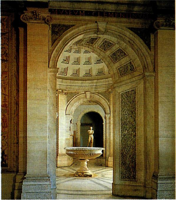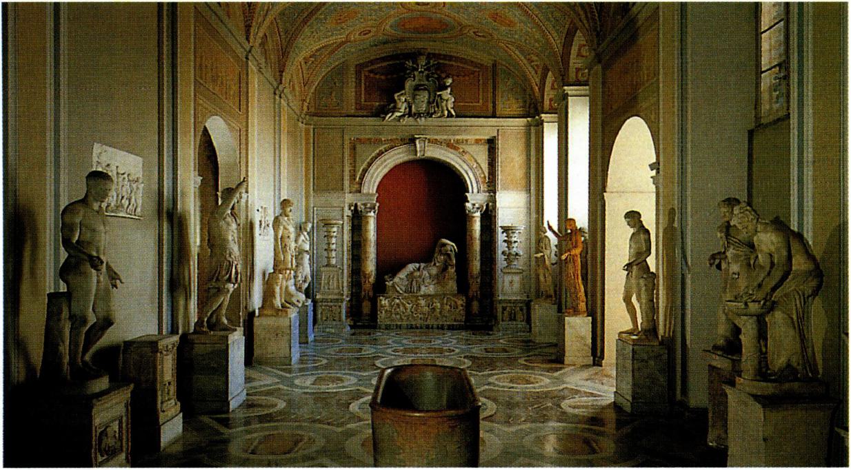 각 방에는 여러 가지 이름이 붙여졌다. 이 방들은 예술 작업을 위해 특별히 지어졌음에도 불구하고 예술은 장식 으로써 다루어졌으며, 확실한 건축학적인 근거를 갖고 계획적으로 설계하였음에도 현재는 시대에 뒤진 박물관 으로 평가되고 있다. 이 박물관에는 율리오 2세 교황(1503 ~1513) 때부터 수집하기 시작한 고대 조각 소장품들, 즉 로마와 그 주변 지역에서 발굴을 통해 얻어진 고대의 석 관, 입상, 부조, 조각 등이 전시되어 있다. 유명한 상으 로는 기원전 4세기경의 쥬피터 신의 두상, 미론(Myron) 의 <원반 던지는 사람)(Discobolos), , 율리오 2세 교황의 소장품이었던 <아폴로>상과 <라오콘>(Laocoön) , 소크라 테스와 플라톤의 입상 등이다.