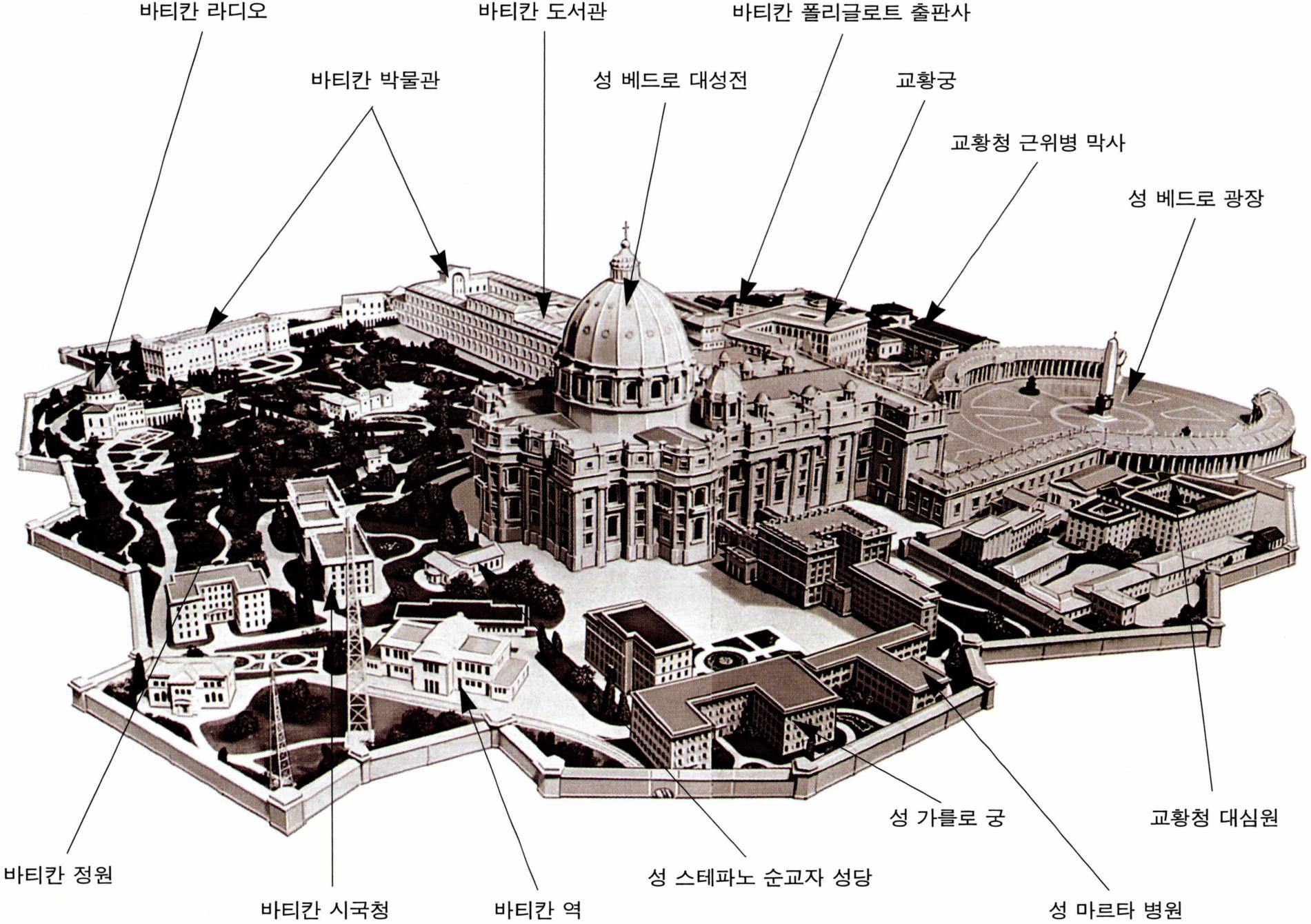 로마 가톨릭 교회의 중심지로서, 라테란 조약(Pactum Lateranense)에 의해 1929년에 세워진 교황청과 이탈리 아 왕국 사이의 도시 국가. 세계에서 가장 작은 국가 중 의 하나인 바티칸 시국은 교황청과는 구별되는 국제법상 의 독립 주권을 세계 각국으로부터 인정받고 있다. 이탈 리아의 로마 시내 테베레(Tevere) 강 서쪽에 있으며, 성