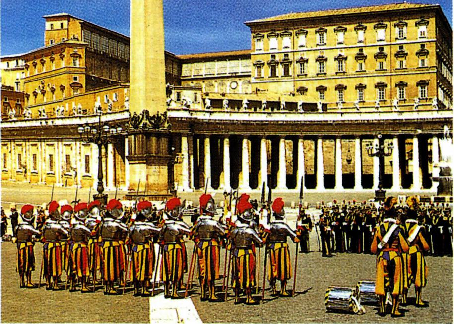 1534)를 보호함으로써 명성을 얻기 시작하였다. 1816년 에 '교황청 기총병' (Pontifical Carabineers)이라는 이름을 받았지만, 1850년에 현재의 이름으로 재창설되었다. 1959년에는 교황 요한 23세(1958~1963)에 의해 대령인 지휘관과 지도 신부를 포함하여 4명의 장교, 4명의 부지 휘관, 2명의 고수(鼓手), 70명의 근위병으로 다시 개편 되었다. 이들은 공식적으로는 교황의 관할하에 있지만 직접적으로는 바티칸 시국 교황청위원회 의장 추기경의 통제를 받는다. 바티칸시와 교황궁, 교황청의 출입구 경 비, 카스텔 간돌포의 치안도 책임 맡고 있으며, 교황 집 전 행사 때에는 교황 보호를 담당한다. 전통적인 복장에 칼과 창으로 무장하는 것이 일반적이나, 경우에 따라서 는 최루탄 발포기로 무장하는 경우도 있다.