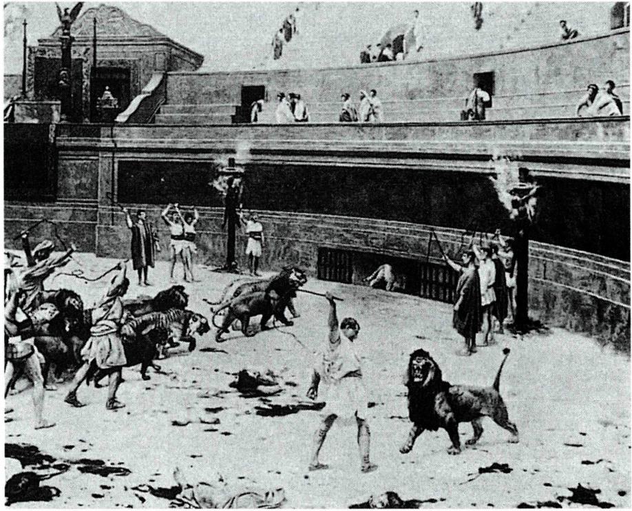 그리스도인의 처형지로 쓰였던 콜로세움(왼쪽)과 이 원형 극장에서 맹수형이나 화형을 당하는 그리스도인들.