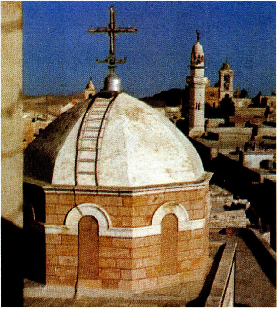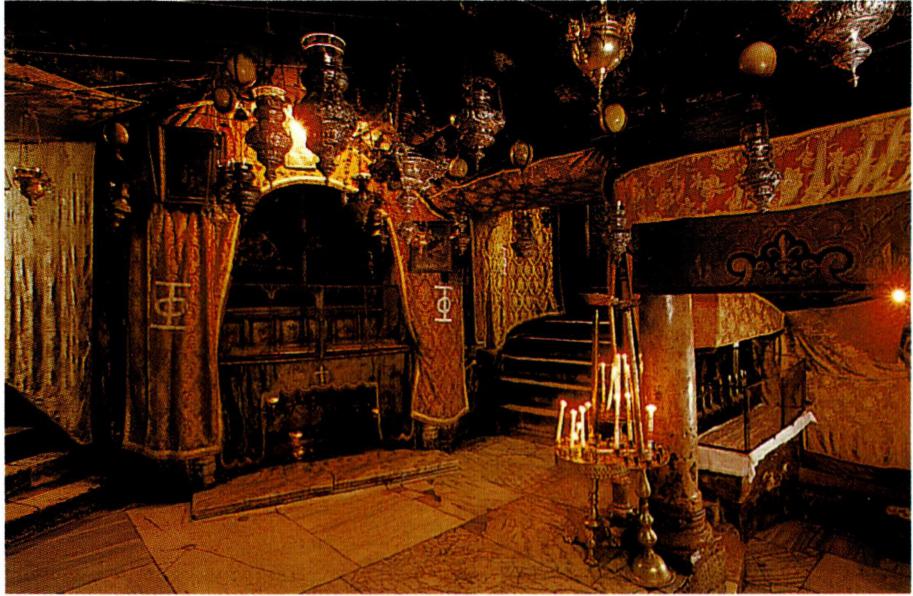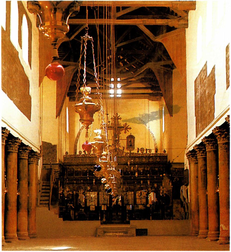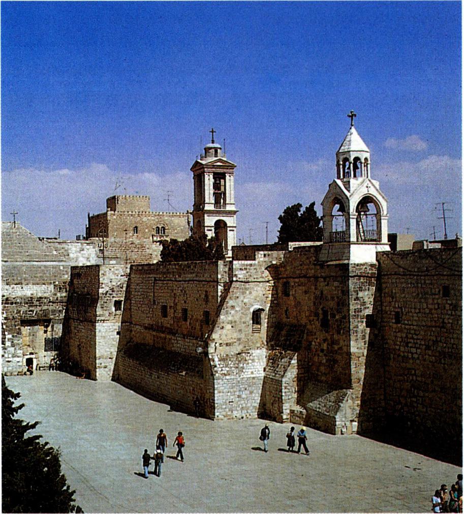 〔유 적〕 예수 탄생 성당 : 콘스탄틴 대제의 어머니 성녀 헬레나는 324년에 베들레헴으로 순례 와서 예수의 탄생지로 전해 오는 동굴을 참배한 후 아들에게 청해서 바로 그 동굴 위에다 성당을 짓게 하였다. 공사는 정성을 다했기 때문에 오래 걸려 339년 5월 31일에 축성되었는데, 이 성당을 '콘스탄틴 성당' 이라고 한다. 그 후 이 성당은 불탔는데 그 시기와 화재 원인에 관해서는 설이 많다. 짐작하건대 510년 대지진 때 화재가 났거나, 아니면 529년 사마리아인들의 폭동 때 불타 버렸을 것이다. 다행히 콘스탄틴 성당 바닥을 장식했던 모자이크 일부가 지금의 예수 탄생 성당 중앙 통로 중간 지점에 보존되어있다. 나무판자를 들추면 아름다운 십자가 모자이크가 보이는데 곡선이여러 겹 교차해 있는 것이 우리 나라의 매듭 기법을 연상하게 한다. 유스티니아누스 황제(527~565)가 531년에 완공한 지금의 예수 탄생 성당은, 그 후 지붕과 바닥과 내부 장식 정도만 바뀌었을 뿐 나머지는 거의 원형 그대로 보존되어 있다.