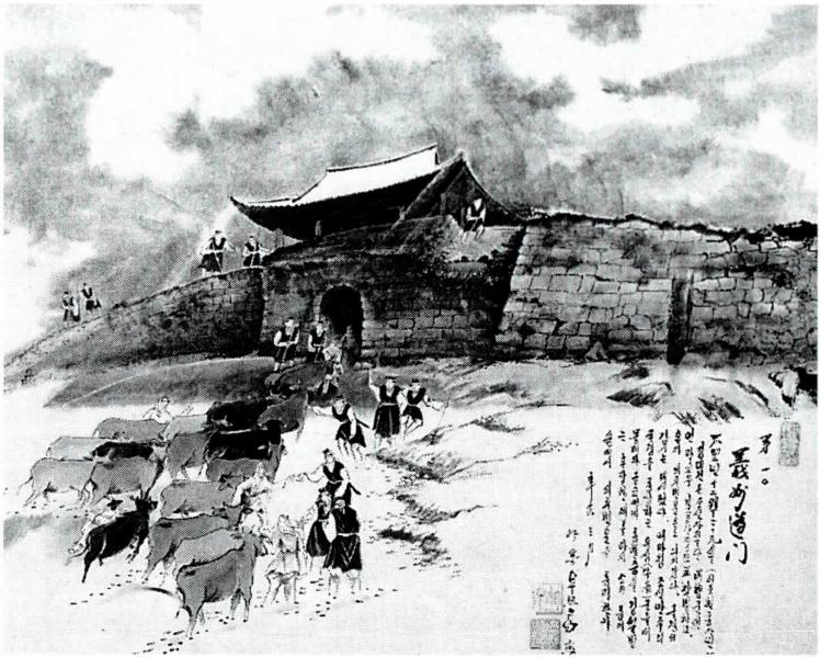 의주 변문 전경(왼쪽)과 1842년 12월 29일 이곳을 통하여 조선으로 입국하는 김대건 신부(탁희성 작) .