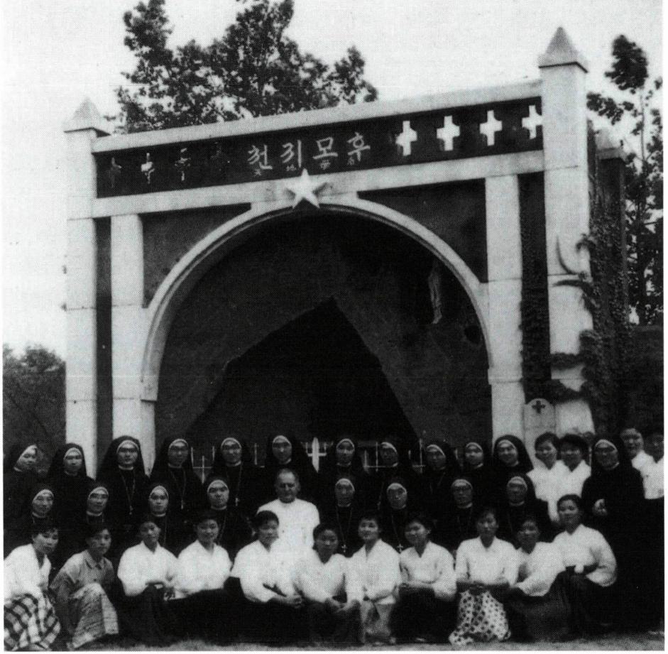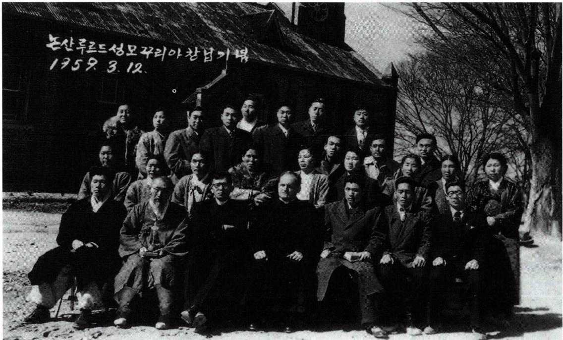 ▲ 옛 성당 내부 모습(왼쪽)과 1959년 3월 12일의 루르드의 성모 꾸리아 창립 기념.