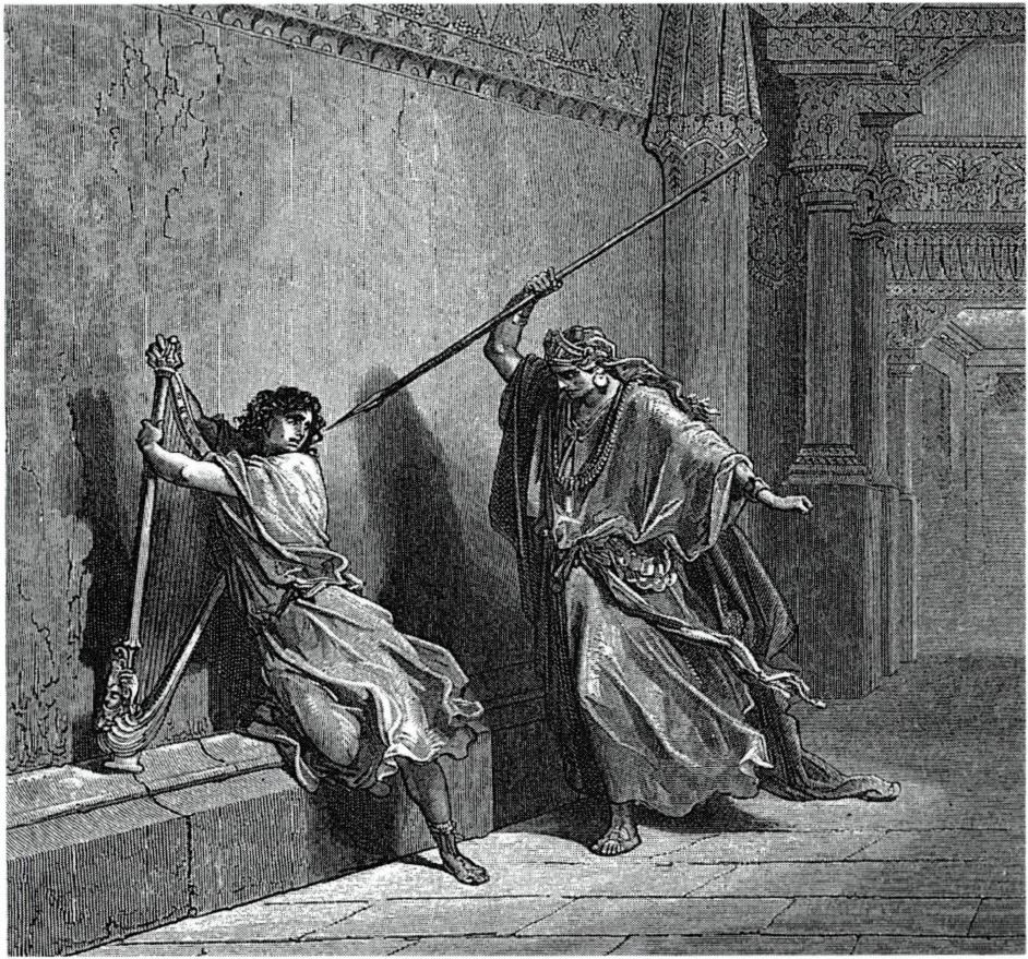 이스라엘의 첫 번째 왕인 사울(왼쪽)과 창을 던져 다윗을 죽이려고 하는 사울 왕