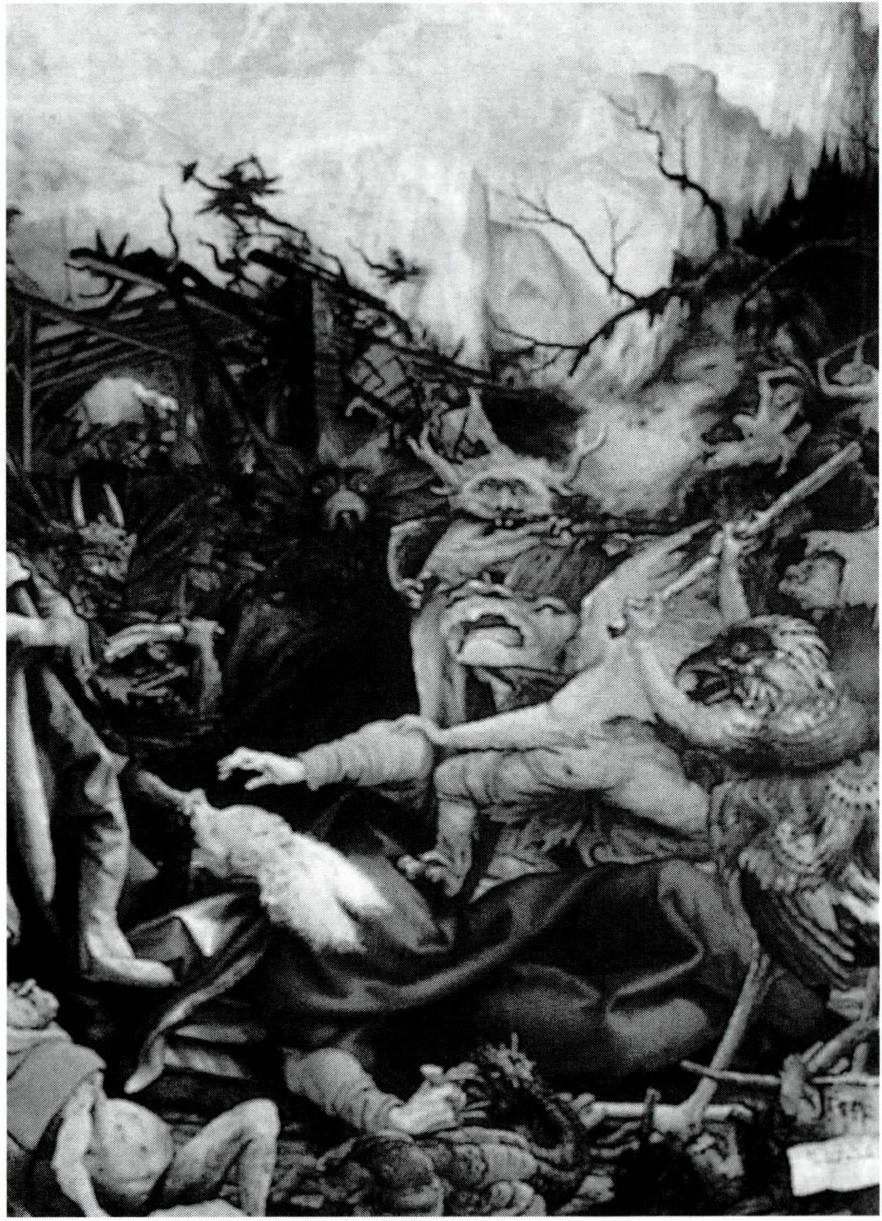 그리스도교 미술에서 처음으로 사탄이 묘사된 것은 6세기경에 소품과 프레스코화에 천상의 인물로 그려진 때부터이다. 그 대표적인 작품이 라벤나(Ravena)의 산 아폴리나레 누오보(S. Apollinare Nuovo)에 있는 모자이크 <염소들에서 양을 구분해 내는 그리스도>인데, 이 그림에는 천사와 염소들이 함께 그려져 있다. 하지만 중세 미술에서는 사탄이 추악하고 혐오스러운 괴물로 묘사되어 중세의 대중적인 민간 전승으로 이어졌다. 특히 11세기의 로마네스크 양식과 고딕 양식의 그림 <최후의 심판>에서 사탄은 동물의 머리를 한 반쪽 인간의 모습으로 묘사된 무시무시한 괴물로 등장한다. 그 후 사탄은 날개나 뿔, 꼬리가 달린 동물적인 본성을 드러내는 모습으로 묘사되기도 했다. 사탄의 그림이 절정을 이룬 시기는 15~16세기로서 사탄은 검은 색으로 채색되어 나타났다. 대표적인 그림이 1513년 뒤러(A. Diirer, 1471~1528)의 판화<기사(騎士), 죽음 그리고 악마>와 그뤼네발트(M. Griine-wald, 1455?~1528)의 <성 안토니오의 유혹>이다. 또 구스(Hugo van der Goes, 1440?~1482)는 <하와의 유혹>에서 사탄을 사람의 머리를 가진 뱀으로 묘사하였으며, 그 밖에도 용이나 사자와 같은 동물로 묘사되기도 하였다. (⇦ 마귀 ; 마귀 들림 ; → 귀신 ; 베엘제불 ; 사탄주의 ;악마)