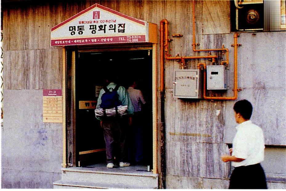 산업 선교를 위해 결성된 가톨릭 노동 청년회의 '국제의 날' 행사(왼쪽)와 IMF 이후 시작된 실업자나 노숙자를 위한 무료 식사 제공.