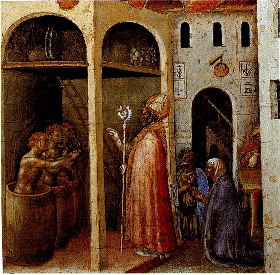 오늘날 산타 클로스로 널리 알려진 성 니콜라오는 가난한 상인의 세 딸에게 결혼 지참금을 주고(왼쪽), 죽을 위험에 처한 세 어린아이를 구해 주었다고 한다.