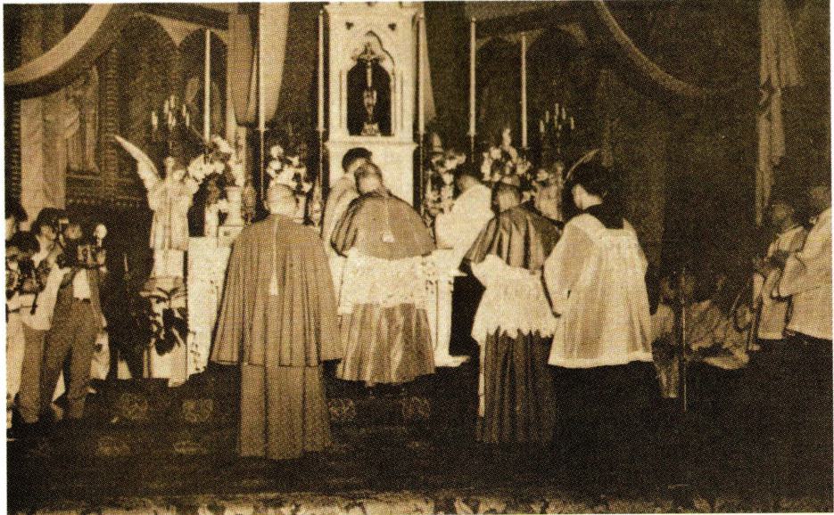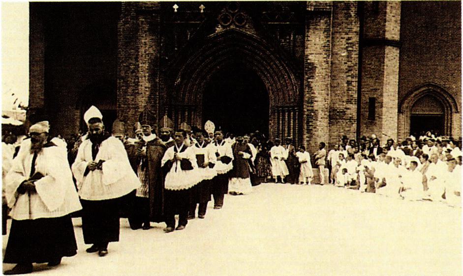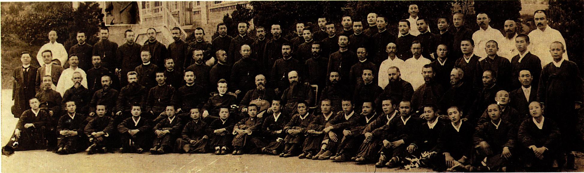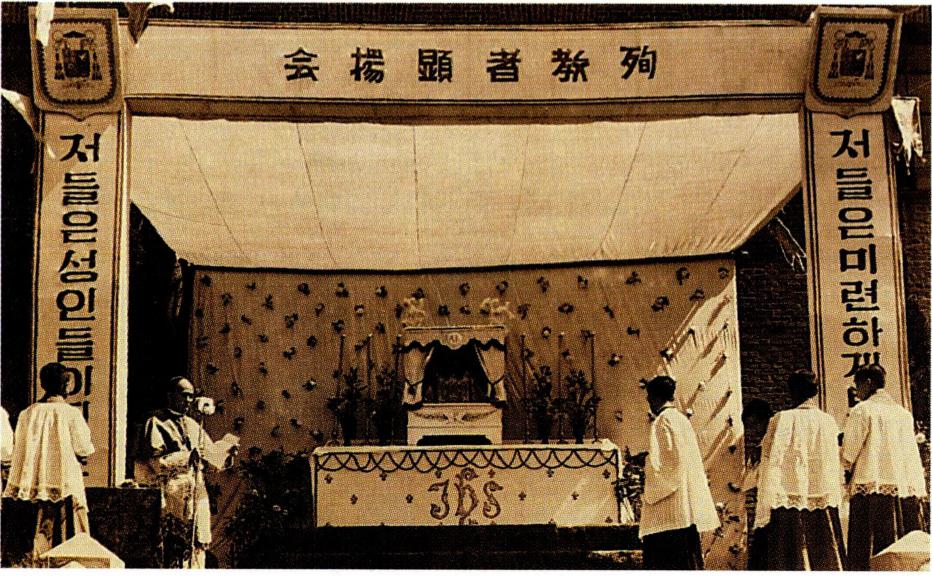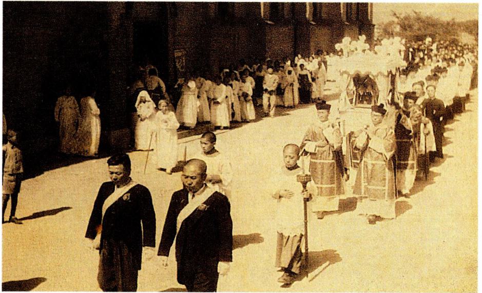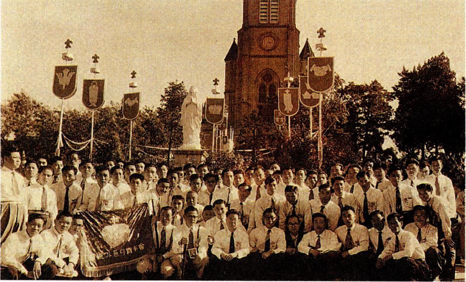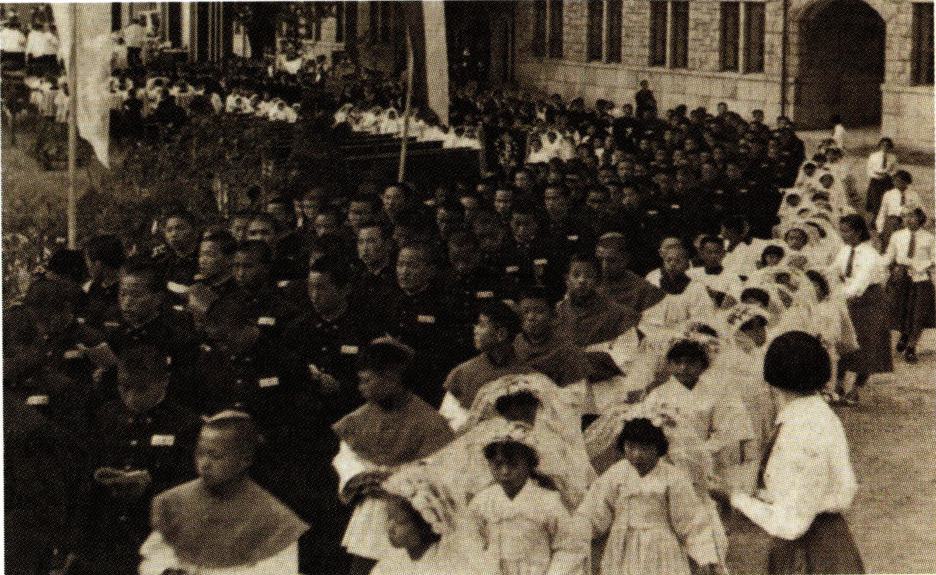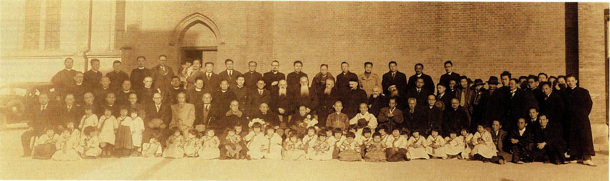 1924년 9월 21일 경성교구 천주교 청년 연합회 창립 총회에 참석한 각 지방 대표들(왼쪽)과 1931년 9월 31일의 전 조선 주교 회의 개막 미사 후의 퇴장 행렬