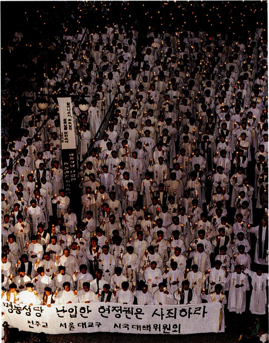 서울대교구의 사회 참여 운동은 1974년 7월 6일 원주교구장 지학순(池學淳, 다니엘) 주교의 체포를 계기로 전환기를 맞이하게 되었다. 또 이를 기해 천주교 정의 구현 전국 사제단과 정의 평화위원회의 활동이 활발해지게 되었으며, 1975년 2월 4일에는 명동 성당에서 인권 · 민주 회복을 위한 기도회가 개최되었고, 이듬해 삼일절에는 <민주 구국 선언문>으로 이른바 '명동 사건' 이 발생하면서 많은 성직자와 지도층 인사들이 체포 구금되었다. 이후 각 본당에서는 구국 기도회가 연이어 개최되었으며, 서울대교구와 명동 성당은 점차 민주화 운동의 중심에 서게 되었다.