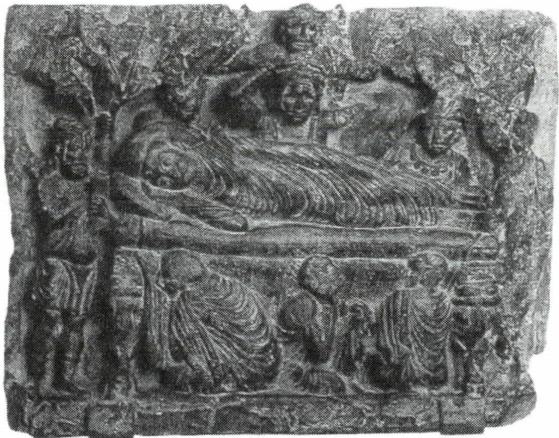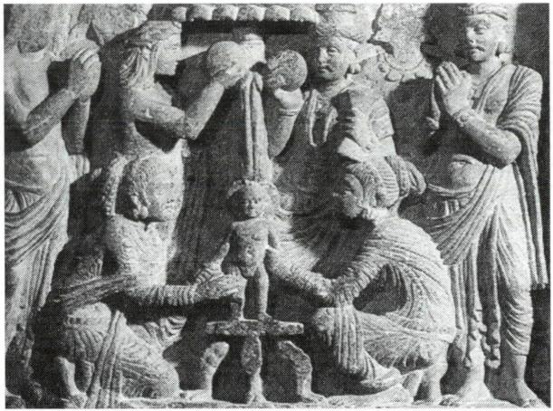 석가모니의 생애를 묘사한 불전 조각. (왼쪽부터) 탄생, 관수(灌水), 열반.