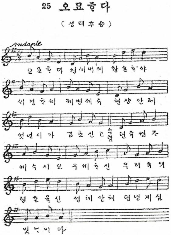 성가》이다. 현존하는 최초의 성가집인 이 《죠션어 성가》 에는 모두 62곡이 수록되어 있는데 상당 기간 구전되었 거나 등사본으로 전해 내려온 성가, 그리고 프랑스 성가 집인 《청년 성가》(Cantiques de la Jeunesse, 1896)에 수록된 곡들을 포함하고 있다. 그렇지만 이 성가집은 1년 전인 1923년에 덕원 베네딕도 수도원에서 간행한 《조선어 성 가》朝鮮語聖歌, 분실)에서는 한 곡도 수용하지 않았다. 편집 원칙은 프랑스 성가에 한글 가사를 심는 것이었는 데, 25번 <오묘ᄒᆞ다>는 예외적으로 천주 가사를 노래 선 율과 함께 수록하였으며, 수록된 천주 가사는 이 곡을 포 함하여 <.향가>와 <삼세대의>에서 각 7편씩 모두 14편 (성가 번호 5~11, 15~17, 38, 43~45)이다. 이 성가집은 뒤이어 제작되는 성가집들에 지대한 영향을 미쳤지만, 천주 가사적인 한국적 성가의 전통을 단절시키고 한글 성가를 한글 가사로 된 서양 성가로 성격 짓게 하였다. 즉 더 많은 천주 가사를 수록하지 못함으로써 한국적 성 가의 전통을 끊었다는 평가를 받고 있다.