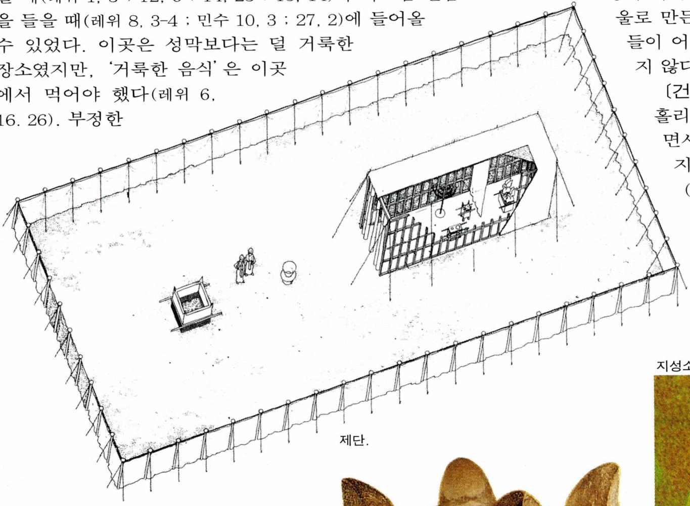 성막 뜰 안에는 이스라엘의 일반 백성들이 제물을 바칠 때(레위 1, 3 : 12, 6 : 14, 23 : 15, 14)나 하느님 말씀을 들을 때(레위 8, 3-4 : 민수 10, 3 : 27, 2)에 들어올 수 있었다. 이곳은 성막보다는 덜 거룩한 장소였지만, '거룩한 음식' 은 이곳에서 먹어야 했다(레위 6, 16). 부정한 상태에 있는 사람은 들어올 수 없었다(12, 4).