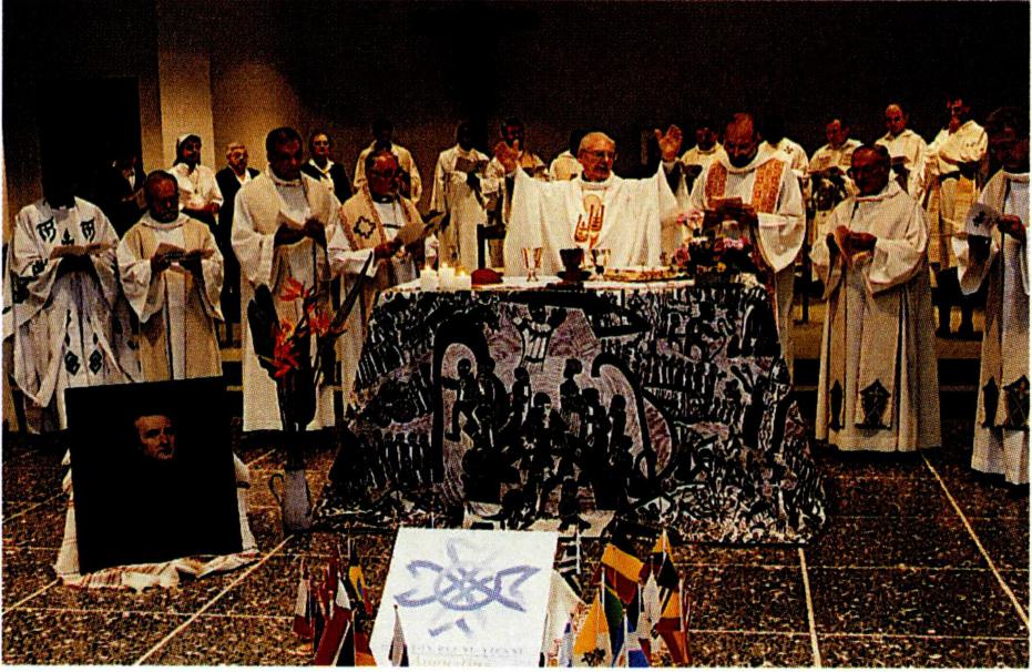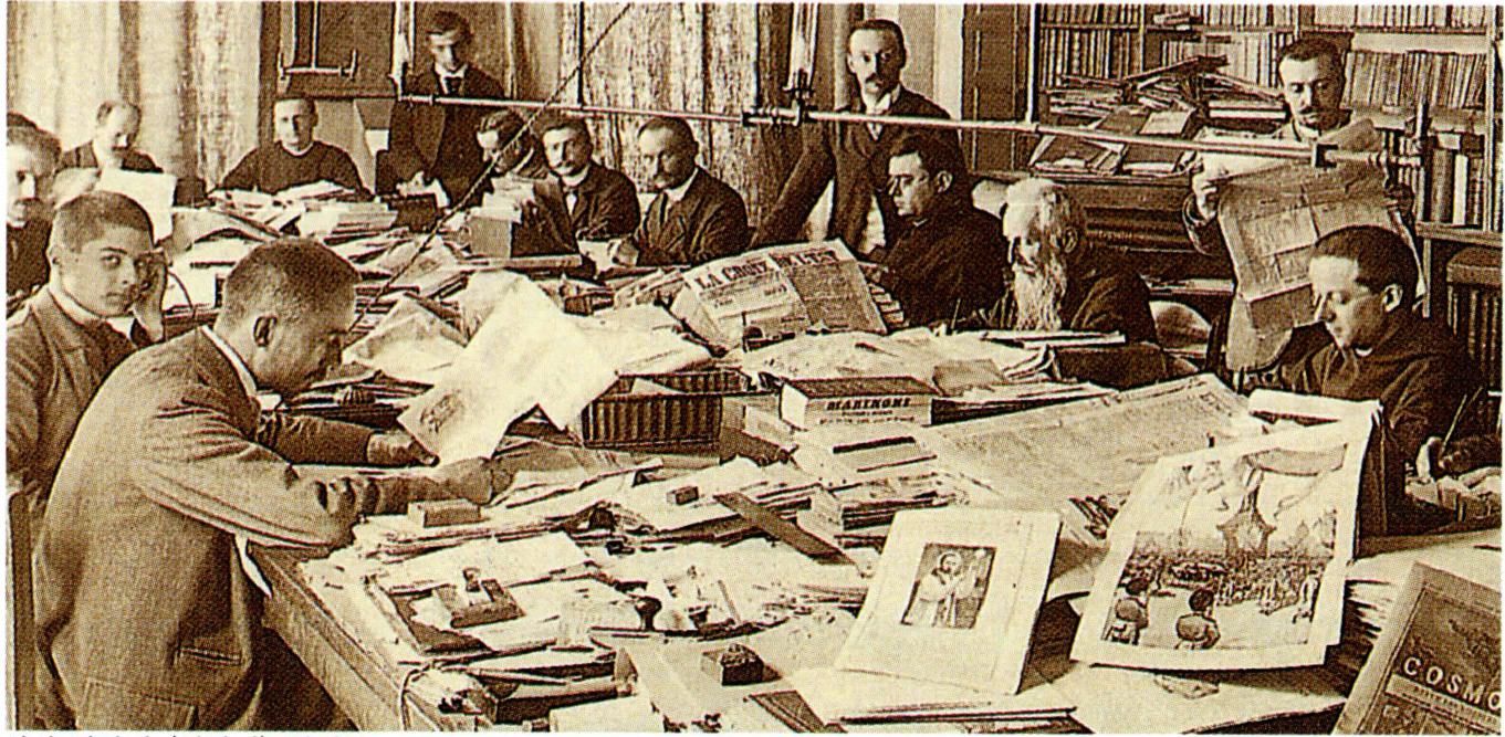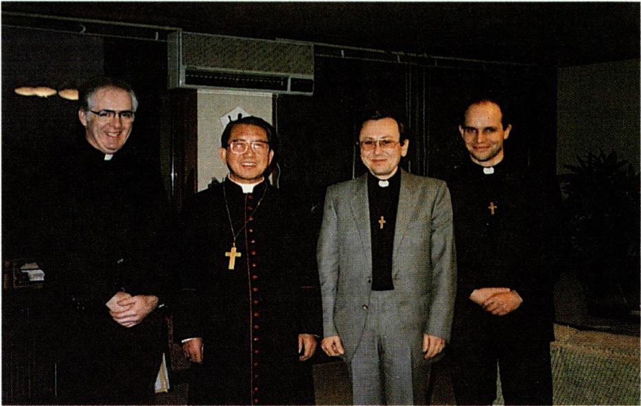 성모 승천 수도회를 창립한 달종 신부(왼쪽)와 신앙 일간지 <십자가> 편집부.