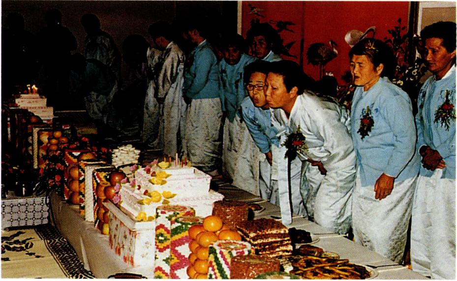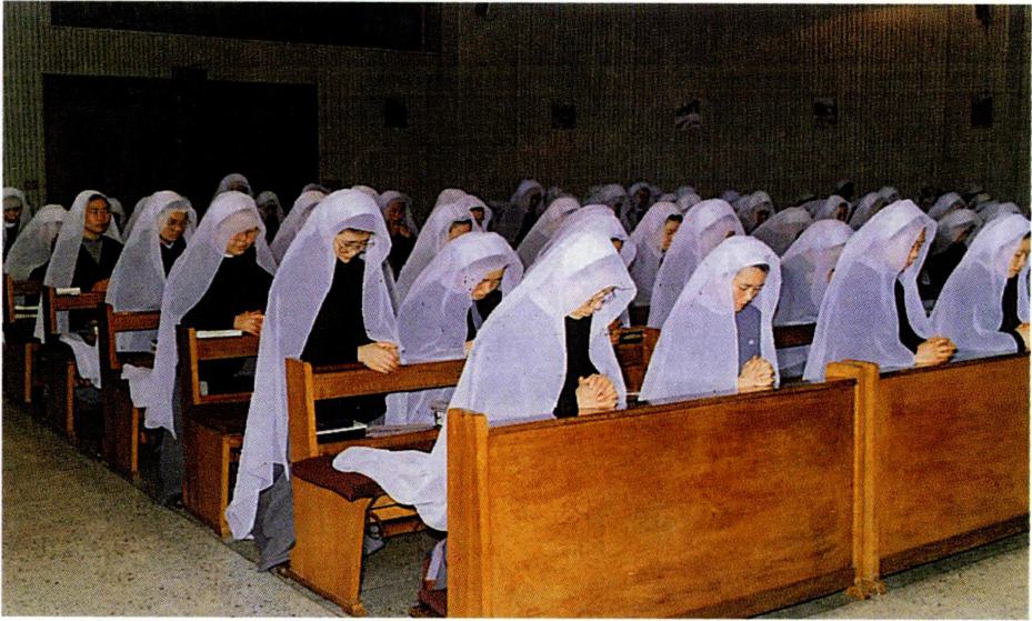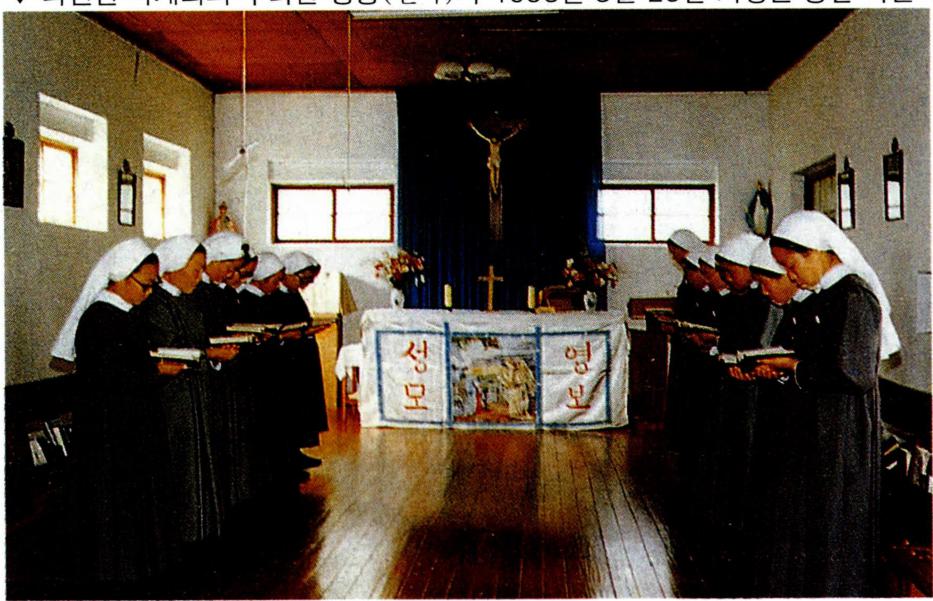 소래면 신천리에 있었던 성모 영보 수녀원 성당 내부 모습(왼쪽)과 1961년 9월 8일의 제1회 착복식.
