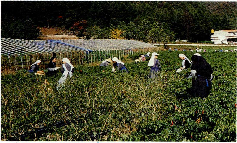 〔사도직 활동〕 부천 신천리에 첫 터전을 마련한 뒤 성모 영보 수녀회는 경제적 자립을 위하여 양계 사업과 목축을 하였을 뿐만 아니라 파인애플을 재배하거나 미사용 포도주를 제조하는 등 궂은 일을 마다하지 않았다. 또 본원을 과천 막계리로 이전한 뒤에는 양계 사업과 각종 과수 사업을 병행하였으나 경험 부족으로 여러 차례 실패를 거듭하였다. 이처럼 수도 생활이 너무 고된 탓에 한때는 성소자가 급격히 감소하였으나, 육체적 노동이 영성 생활에 더욱 큰 힘이 될 수 있다는 설립자의 신념과 수녀회의 지도 이념에 따라 회원들은 더 엄격하게 양성되었다.