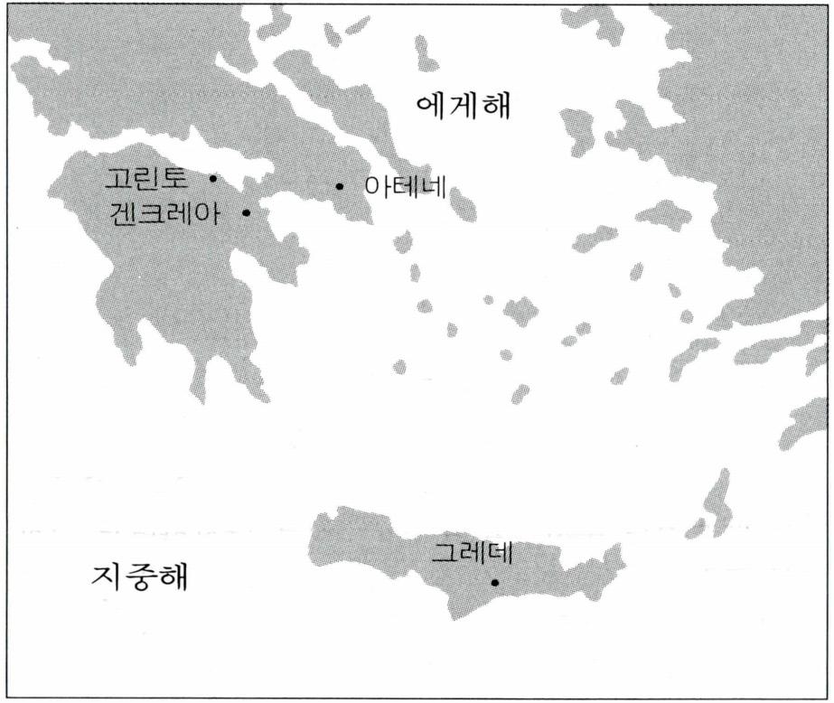 〔고린토〕 지금의 그리스 본토와 펠레폰네소스 반도를 연결하는 지협 이스무스 서남단에 위치하고 있다. 고린토 자체는 항구 도시가 아니지만 양편에 두 항구를 끼고 있었다. 북쪽 고린토 만에는 레카이온 항구가 있어 아드리아해로 통했고, 동쪽 사론 만에는 겐크레아 항구가 있어 에게해로 통했다. 이처럼 고린토는 육로로는 남북으로 통하는 통로요, 해로로는 동서로 통하는 교통의 요충지였다. 따라서 고린토는 동서간의 자연적인 무역 중심지가 되어 상업이 번창했다. 호머는 이 도시를 일컬어 '부유한 고린토 라고 하였다.