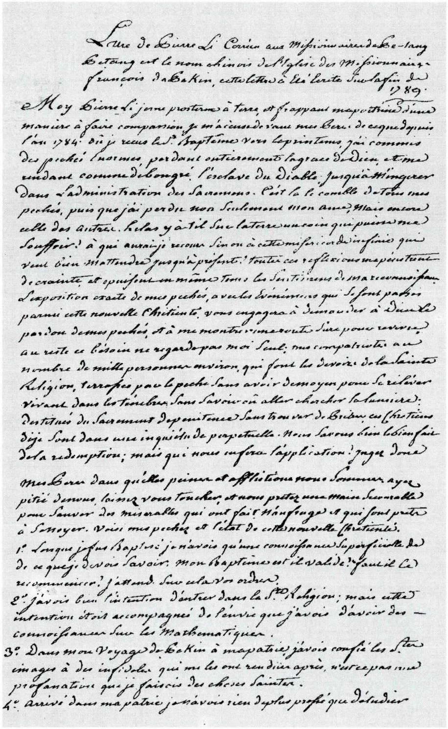1789년 말 북당의 선교사에게 보낸 이승훈의 첫째 편지(불역). 자신의 배교와 죄를 고백하고 몇 가지 의문점에 대한 답을 청하고 있다.