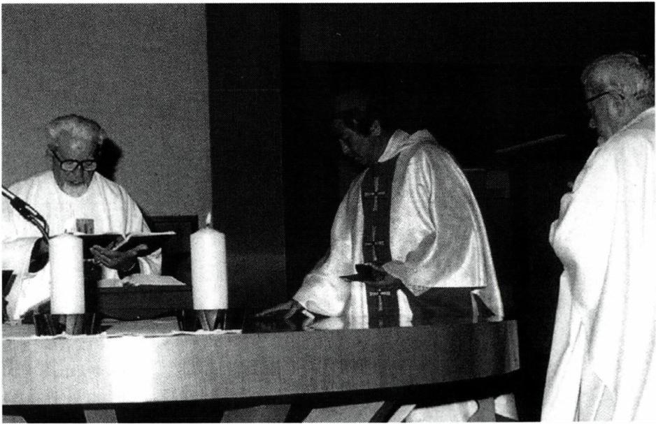 성목요일 성유 축성 미사(왼쪽) 때 축성된 성유는 성당이나 제대 축성시에도 사용된다.