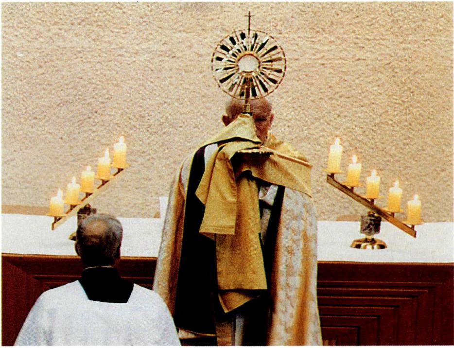 성체 신심이란 성체의 형상 안에 예수 그리스도가 현존한다는 믿음(왼쪽)과 성체에 대한 공경을 표현하는 신심 행위이다.