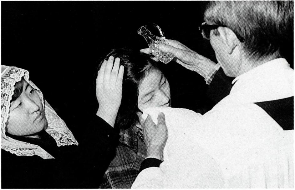세례수는 부활 성야 미사 중과 세례성사 집전 중에 축복되며(왼쪽), 예비 신자 머리에 세례수를 세 번 붓는 방식으로 세례가 이루어진다.