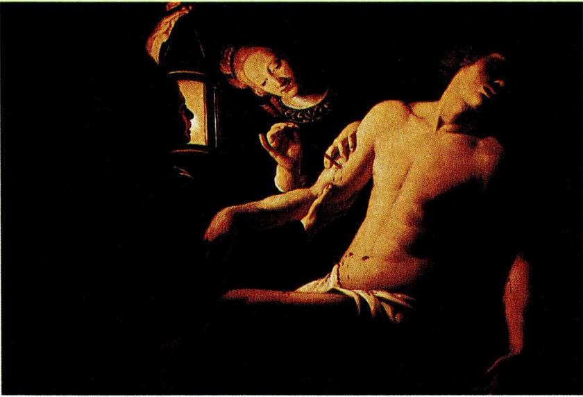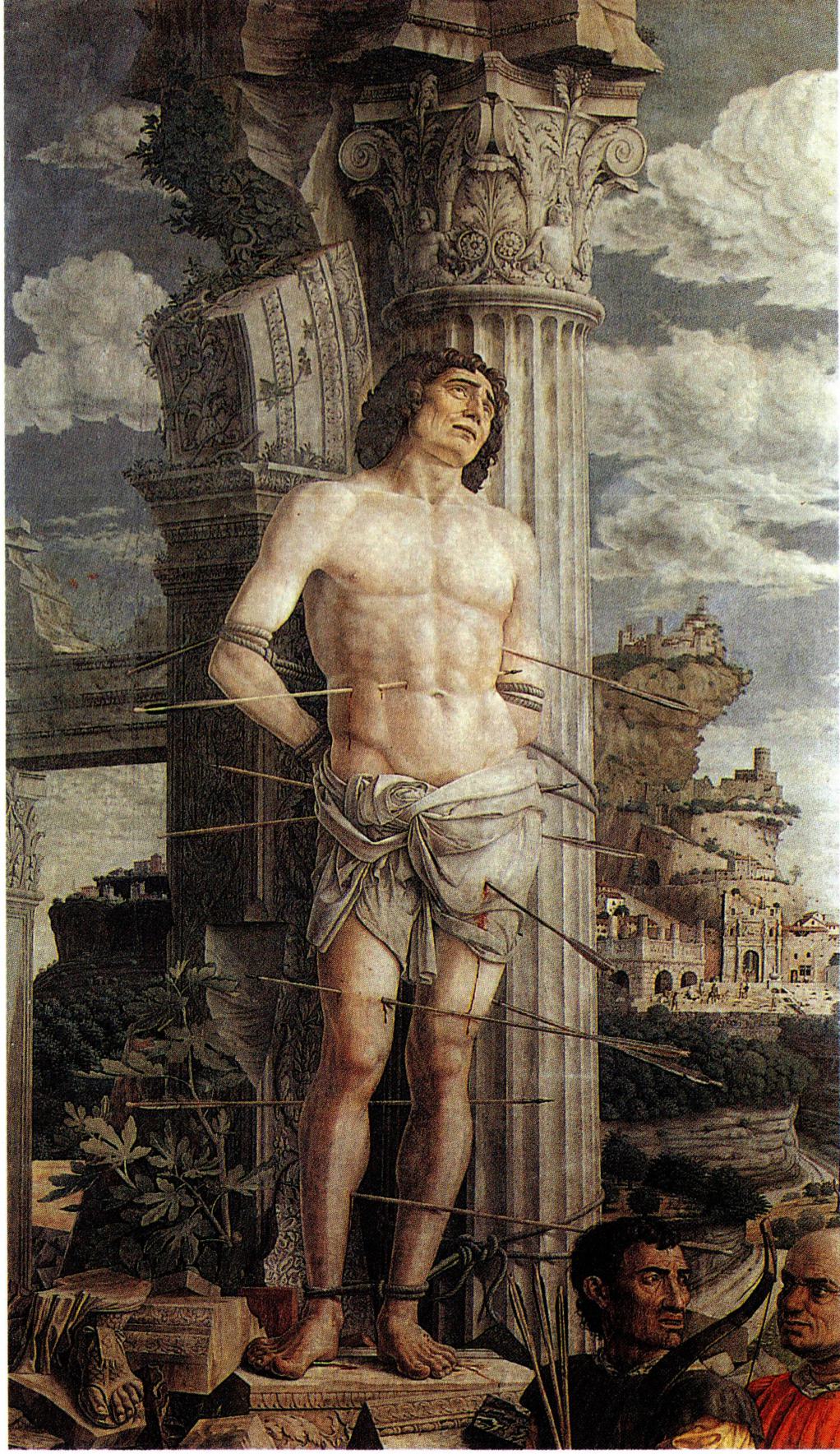 〔성 화〕 성 세바스티아노를 주제로 한 미술 작품으로 는 두 가지 유형의 작품이 전해 오고 있다. 첫 번째 유형 은 노년의 궁정 관료 모습으로, 로마의 성 갈리스도 카타 콤바에 있는 성녀 체칠리아(Cecilia)의 지하 묘지에 있는 5세기경의 프레스코화가 가장 오래된 작품이다. 이 작품 에는 토가를 입은 세 명의 순교자(Policamus, Sebastianus, Quirinus)가 그려져 있다. 또 하나는 7세기에 만들어진 로마 의 성 베드로 사슬 성당의 모자이크로, 세바스티아노가 궁정복을 입고 손에는 보석이 박힌 왕관을 든 백발 노인 의 모습으로 나타나 있다. 이러한 유형의 성화는 15세기 까지 지속적으로 등장하였다. 15세기의 한 작품에는 세 바스티아노가 천사의 호위를 받으면서 하늘에서 예수 그 리스도가 쏘는 페스트의 화살을 막기 위해 자신의 망토 를 넓게 펼쳐 마을 주민들을 감싸고 있는 장면이 그려져 있다(Benozzo Gozzoli, Scènes de la Vie de Saint Augustin, 1465, 산 지 미냐노의 산 아고스티노 성당 소장). 또 세바스티아노 성인 이 노년의 로마 병사의 모습으로 갑옷에 창과 검과 방패 를 들고 있는 13세기의 작품도 있다(Pietro Cavallini, 로마 벨 라브로의 산 조르지오 성당 소장).