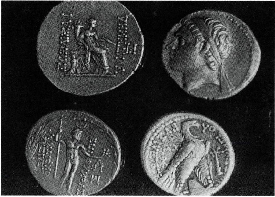 안티오쿠스 4세 에피파네스 때 통용되던 화폐(왼쪽)와 셀레우코스 왕조 때 축조된 안티오키아 항구의 방벽.