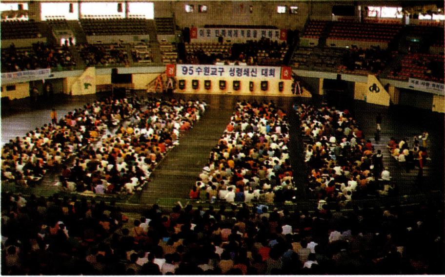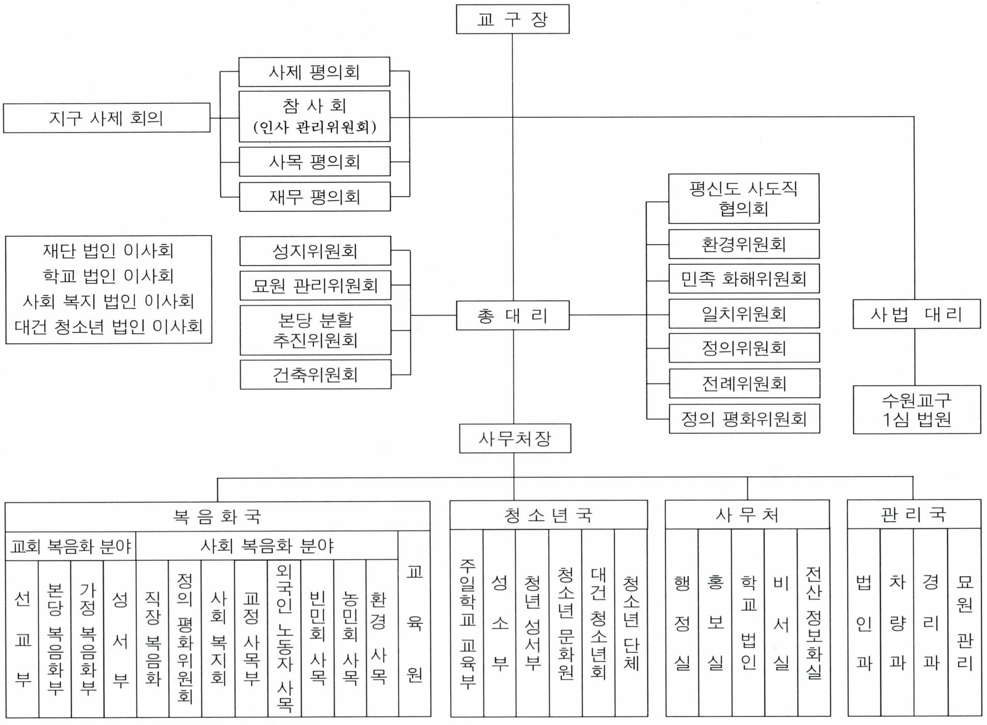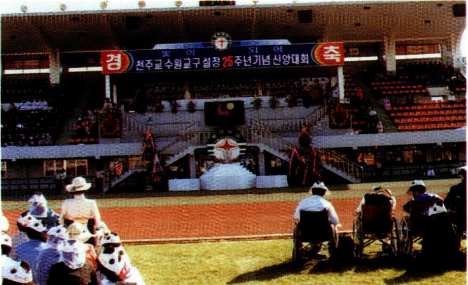 〔교구 설정 25주년과 교세 확대〕 교구 설정 25주년인 1988년을 맞아 교구에서는 먼저 2월 29일에 중 · 고등학생 신앙 대회를, 5월 8일에는 어린이 신앙 대회를 수원 실내 체육관에서 개최하였으며 9월 10일에는 청년신앙 대회를 배론 성지에서 개최하였다. 이어 10월 9일에는 수원 공설 운동장에서 "빛이 되어" 라는 주제 아래교구 신앙 대회를 성대하게 개최하였고, 10월 30일에는 교구 성가 경연 대회를 시민 회관에서 개최하였다. 이처럼 교구가 설정된 지 25주년이 되는 1988년의 교구 현황을 살펴보면, 총 신자수가 205,435명으로 교구 설정 당시에 비해 4.8배 이상 증가하였고, 본당수는 66개로 2.75배, 성직자수는 135명으로 4.8배나 증가하였다. 당시 교구청 직제는 사무처 아래 사목국 · 관리국 · 교육국을 두고 다시 그 아래에 총무부(사목과 · 경리과 · 서무과 · 교육과)를 두는 체제였으나, 1987년에 성소국이 교육국에서 분리 · 신설되었다.