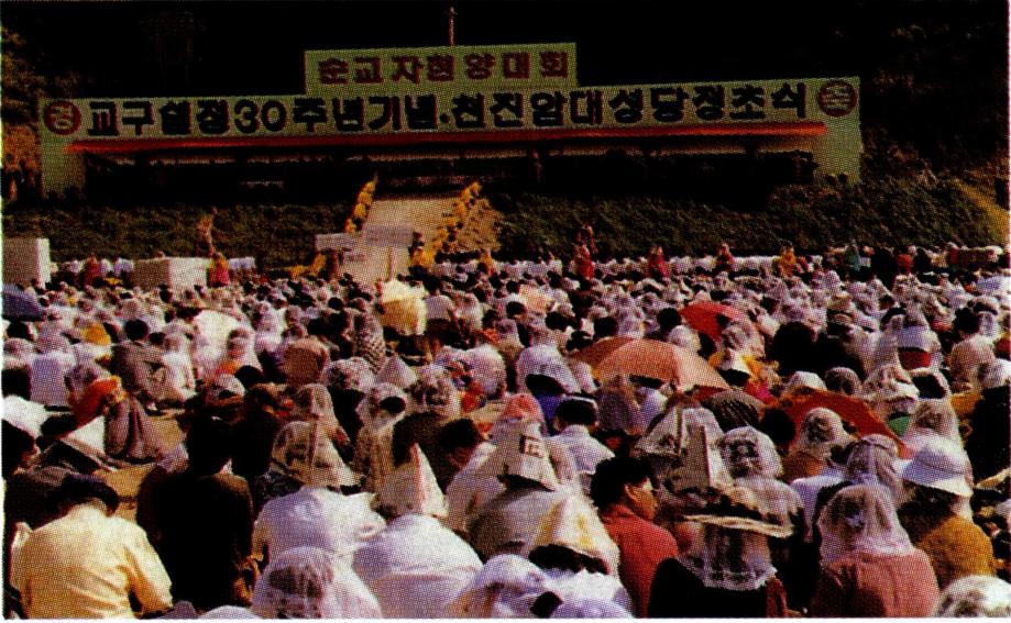 1977년 4월 5일 수원교구 평신도 사도직 협의회가 4년 만에 다시 발족되었으며, 같은 해 9월 16일에는 구산에 순교 복자 김성우(金星禹, 안토니오) 현양비가 건립되면서 성역화 작업이 추진되었다. 이어 1980년대에 들어서는 그 해 4월 16일에 매리지 엔카운터(M.E) 수원 협의회가 창립되었고, 12월 8일에는 교구 가톨릭 여성연합회가, 1981년 1월 20일에는 교구 가톨릭 의사회가 발족되었으며, 같은 해 3월 19일에는 교구 '천지의 모후' 꼬미시움이 레지아로 승격되었다. 천진암에서 제1회 한국 천주교회 창립 행사가 개최된 것도 1981년 6월 24일이었고, 서울 여의도 광장에서 조선교구 설정 150주년 기념 전국 신앙 대회가 개최된 것도 같은 해 10월 18일이었다. 반면에 이 시기에는 1979년의 10 · 26 사태와 이듬해 5월의 광주 민중 항쟁으로 인해 각 본당이나 단체별로 구국 기도회 및 구호품 모금 운동이 활발히 전개되기도 하였다.
