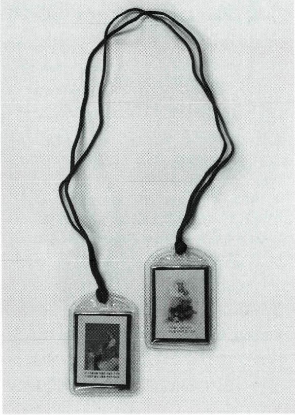 가슴과 등쪽으로 길게 늘어뜨린 스카풀라(왼쪽)와 일반 신자들이 착용하는 스카풀라.
