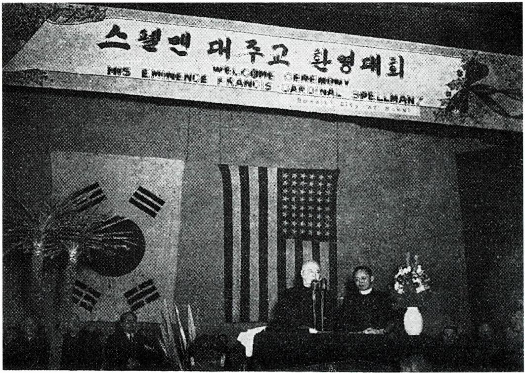 〔한국과의 관계] 스펠만과 한국과의 인연은 해방 시기부터 시작되었다. 당시 가톨릭 군종 책임자였던 그는 미군이 인천에 상륙하던 1945년 9월 8일 하지(J.R. Hodge, 1893~1963) 중장과 함께 입국하여 다음날 총독부에서 일본군의 항복을 받는 자리에 참석하였다. 그리고 노기남(盧基南, 1902~1984) 주교는 스펠만 대주교, 미군 장병들, 한국 신부와 신자들이 참석한 가운데 첫 한 · 미 친선미사를 이튿날 명동 성당에서 봉헌하였다. 이 미사에서 스펠만은 우리 민족의 해방과 한국 천주교회의 발전, 연합군의 승리를 축하하는 강론을 하였으며, 이후로도 미군정의 고위 인사들과 한국 천주교회의 지도자들의 만남을 주선하는 등 미 군정과 천주교회 간의 협력을 위해 많은 노력을 하였다. 또 1948년에 남한에 단독 정부가 수립되고, 이에 대한 국제적 승인을 얻으려 할 때에도 그는 이승만 대통령과 긴밀한 협조 관계를 유지하며 많은 도움을 주었다. 한국 전쟁이 일어나자 스펠만 추기경은 당시 주미 대사이던 장면(張勉, 요한, 1899~1966)과 함께 미국 내에서 한국인을 돕기 위한 물품 기증 운동을 벌여, 전쟁 기간 중은 물론 그 이후에도 막대한 구호 물품을 전달하였다. 이에 대해 한국 정부는 메리놀 수녀회와 미국 가톨릭 복지 협회(N.C.W.C.) 한국 지부장에게 감사장을 전달하기도 하였다. 또한 그는 해마다 예수 성탄 대축일을 전후로 한국을 방문하여 병사들을 격려하고 많은 자선금을 내 구호 사업을 지원하였다. 이렇게 구호 활동을 적극적으로 주선한 스펠만 추기경이 1953년에 한국을 방문하자, 정부는 중앙청에서 '서울 시민 환영 대회' 를 개최하여 국빈으로 대우하였다. → 미국 ; 엔 시 더블류시)