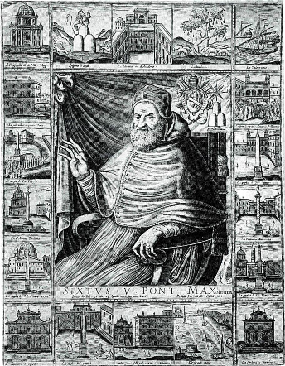 ③ 식스토 5세(1521~1590) : 교황(1585~1590). 본래 이름은 펠리체 페레티(Felice Feretti). 1521년 12월13일 안코나(Ancona) 관구 아스톨리 피체노(AstoliPiceno) 근처의 그로탐마레(Grotarmmme)에)에서 가난한 소작인의 아들로 태어나 12세 때 몬탈토(Montalto) 부근에 있는 끈벤뚜알 성 프란치스코회에 입회하였으며, 1534년에 착복식과 서원을 한 뒤 페라라(Ferrara) · 볼로냐(Bologna) · 리미니(Rimin) · 시에나(Siena) 등지에서 공부하였다. 1547년 시에나에서 사제 서품을 받고 이듬해페르모(Femo)에서 신학 박사 학위를 취득하였으며, 설교가로서도 명성을 얻었다. 또 로올라의 이냐시오(1491~1556)와 필립보 네리(1515~1595) 등과 친분을 나누었고, 1552년에는 프란치스코회의 후원자였던 카르피(Capi)추기경의 주선으로 로마에 갔다가 그곳에서 훗날 교황 비오 5세(1566~1572)가 된 기슬리에리(M. Ghislier)를 만났다. 한편 그는 로마에서 한 사순절 강론으로 유명세를 타 여러 차례 강론을 의뢰받기도 하였다.