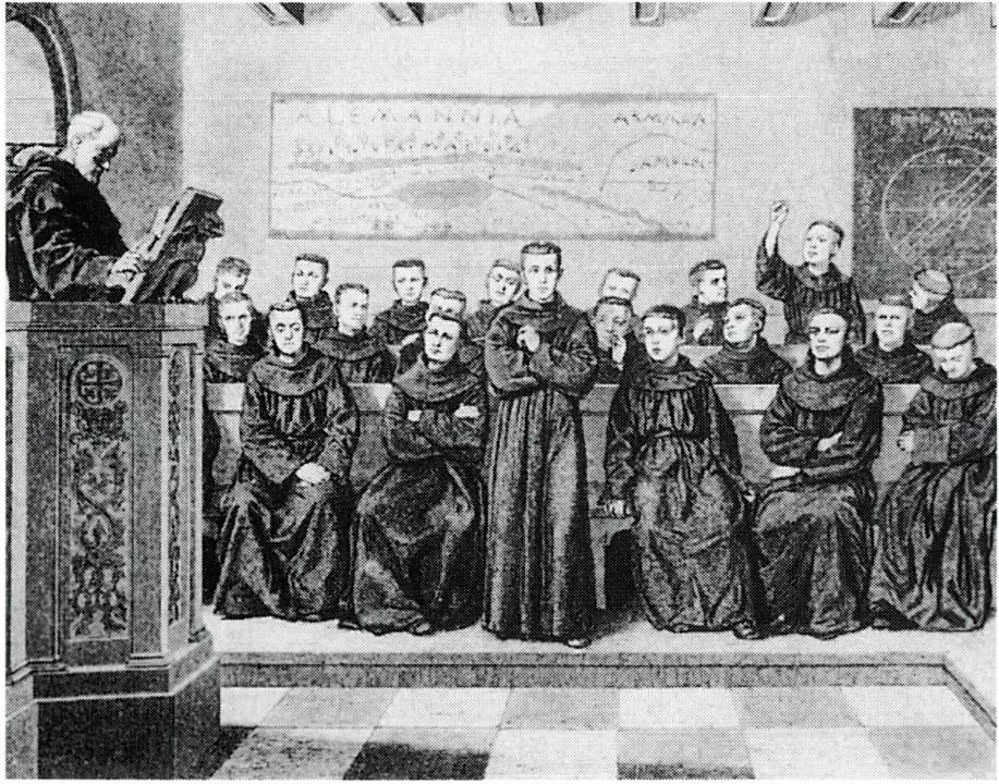 〔신학의 조직화〕 신학 교육의 제도화는 신학 자체의 조직화를 낳았다. 사도 시대부터 신학적 반성이 참조하는 유일한 문서는 성서였는데, 수도자들은 시간 전례 기도를 하면서 성서와 친근하게 되었고 신학도는 구약성서와 신약성서를 해석하여야만 했다. 교사와 학생들은 예로니모 · 암브로시오 · 아우구스티노와 같은 교부들의 성서 주석서들과 간결한 양식으로 작성된 명제집들과 같은 문서들을 중심으로 문제를 제기하고 토론하였다. 이로써 '토의' (disputationes)라는 신학 저술 양식이 생겨났다.
