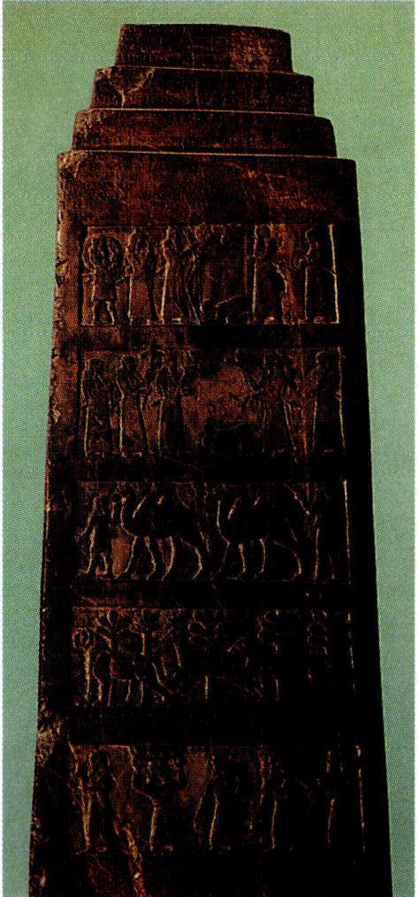 살만네세르 3세에게 공물을 바치는 장면이 묘사된 검은 오벨리스크(왼쪽)와 그의 궁전 청동문 부조, 그리고 아시리아의 설형 문자.