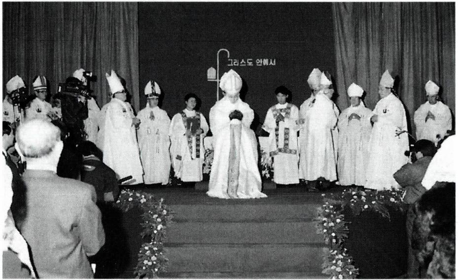 [교구 설정 25주년과 현재〕 1990년 5월부터 교구에서는 한국 천주교회 최초로 '생명의 공동체 운동' 을 전개해 나가기 시작하였다. 이 운동은 생명 운동과 소공동체 운동의 접합을 통하여 농민 운동을 새로운 방향에서 전개하고, 2000년 대희년과 삼천년기의 복음화를 준비한다는 데 목적이 있었다. 그러던 중 초대 교구장 두봉주교가 오래 전부터 교황청에 표명해 온 교구장 사임 건의가 받아들여져 1990년 10월 6일자로 교황 요한 바오로 2세에 의해 박석회(이냐시오) 신부가 제2대 교구장으로 임명되었다. 이에 따라 12월 2일에는 '그리스도 예수 안에서' 라는 사목 표어 아래 박석희 주교의 서품식 및 교구장 이 · 취임식이 거행되었고, 박석희 주교는 그해 12월부터 이듬해 5월까지 사목 순방을 완료한 뒤 사목 방향을 설정하였다. 당시 안동교구의 교세는 25개 본당에 신자수는 40,285명이었다.