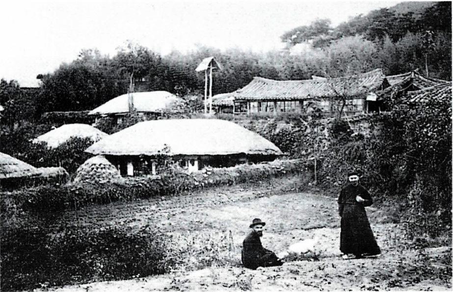 ▲ 현재의 언양 성당 전경(왼쪽) 및 델랑드 신부와 함께 성당 터를 둘러보고 있는 보드뱅 신부.