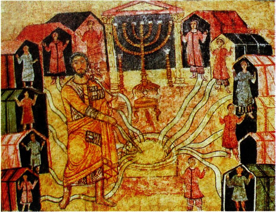 모세의 지팡이로 변화된 생명의 물이 열두 지파로 흘러 나가는 모습을 그린 회당 벽화.