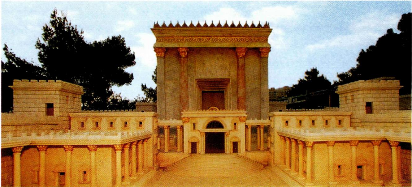 솔로몬 성전 : 솔로몬(기원전 972~933)은 통치 4년부 터 성전을 건축하기 시작하였다. 솔로몬은 예루살렘의 성벽 재건과 궁전 및 성전 등의 건축 사업을 위하여 노동 력은 부역을 동원시켰고, 필요한 목재와 기술은 페니키 아의 띠로 왕 히람과 구상 무역을 통하여 충당하였다. 당 시 레바논의 송백나무와 전나무 등의 목재는 바다에서 뗏목으로 이동되어 예루살렘으로 가는 길목에 위치한 요 파(Joppa) 북부의 야르콘 강으로 운반되었다. 이곳에서 부터는 소나 당나귀 등을 이용하여 예루살렘의 건설 현 장까지 운반되었다. 목재와 기술 지원의 대가로 솔로몬 은 해마다 엄청난 양의 밀(2만 코르)과 기름(20코르)을 제 공하였다. 또한 솔로몬은 필요한 노동력을 제공하기 위 하여 부역을 3만 명이나 소집하여서 한 달에 1만 명씩 번갈아 가며 레바논의 벌목 현장에 투입시켰다. 솔로몬 은 필요한 금을 히람을 통하여 120키카르(5톤)를 제공받 았는데, 이는 페니키아 해운 회사들이 해상 무역을 통해 확보한 것이었다. 솔로몬이 갈릴리 지방의 성읍 20개를 히람에게 건네준 것으로 미루어 보아, 솔로몬이 약속한 대가를 제때에 충분히 지불하지 못했거나 해가 거듭할수 록 히람의 요구 조건이 강화된 것으로 볼 수 있다. 두 국 가 사이의 구상 무역은 성전과 왕궁의 공사 기간인 20년 정도 지속된 것으로 추정된다(1열왕 9, 10). 솔로몬 성전 은 가나안의 전통적인 긴 방(long-room) 구조로 길이가 60암마(30m)에 폭이 20암마(10m)정도였다. 솔로몬 성