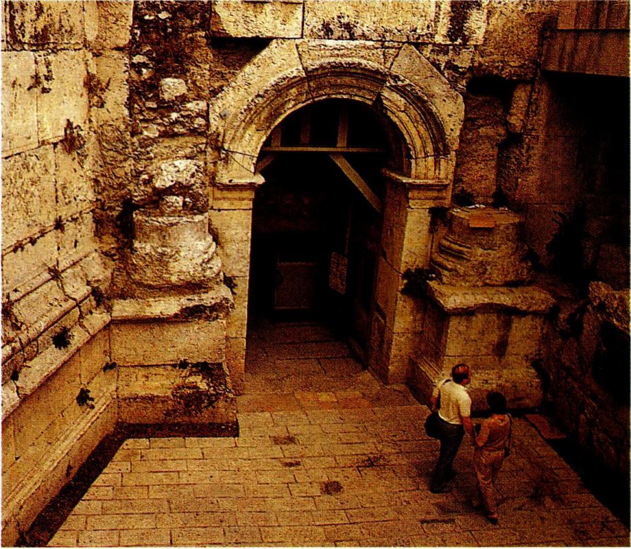 을 깔아 만든 동부 포룸의 일부 분으로 밝혀졌다. 동부 포룸의 서쪽 입구에는 세 겹의 승리 아 치가 건설되었고 이 가운데에서 중앙의 것은 오늘날 사자문에서 비아 돌로로사(Via Dolorosa)로 향하는 길 위에서 그 자취를 찾 아볼 수 있다. 특별히 그리스도 교 전승에서 이 아치는 요한 복 음서 19장 5절에 근거하여 에 체 호모(Ecce, Homo : "자, 이 사람 이다" 라는 의미) 아치로 불려진 다. 헤로데가 건설하였던 성전 터에는 하드리아누스 황제와 그 후계자 안토니우스 피우스 황제