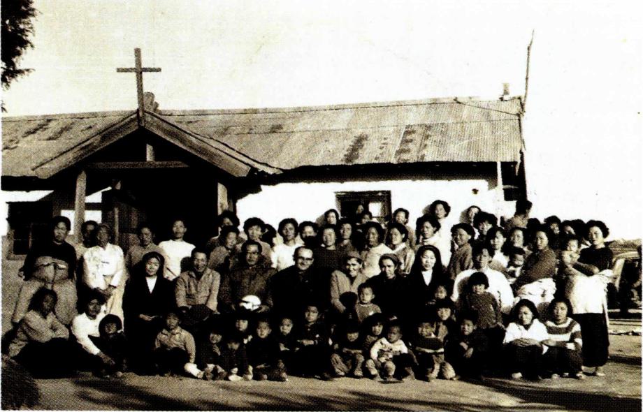 한국 진출 초기에 전북 고창 동혜 마을에서 나환후 가족들(왼쪽)과 동혜원 공소를 방문한 총장 신부와 신자들.