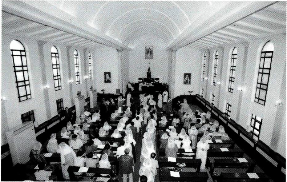 장충 성당 전경(왼쪽)과 2층에서 내려다본 성당 내부.